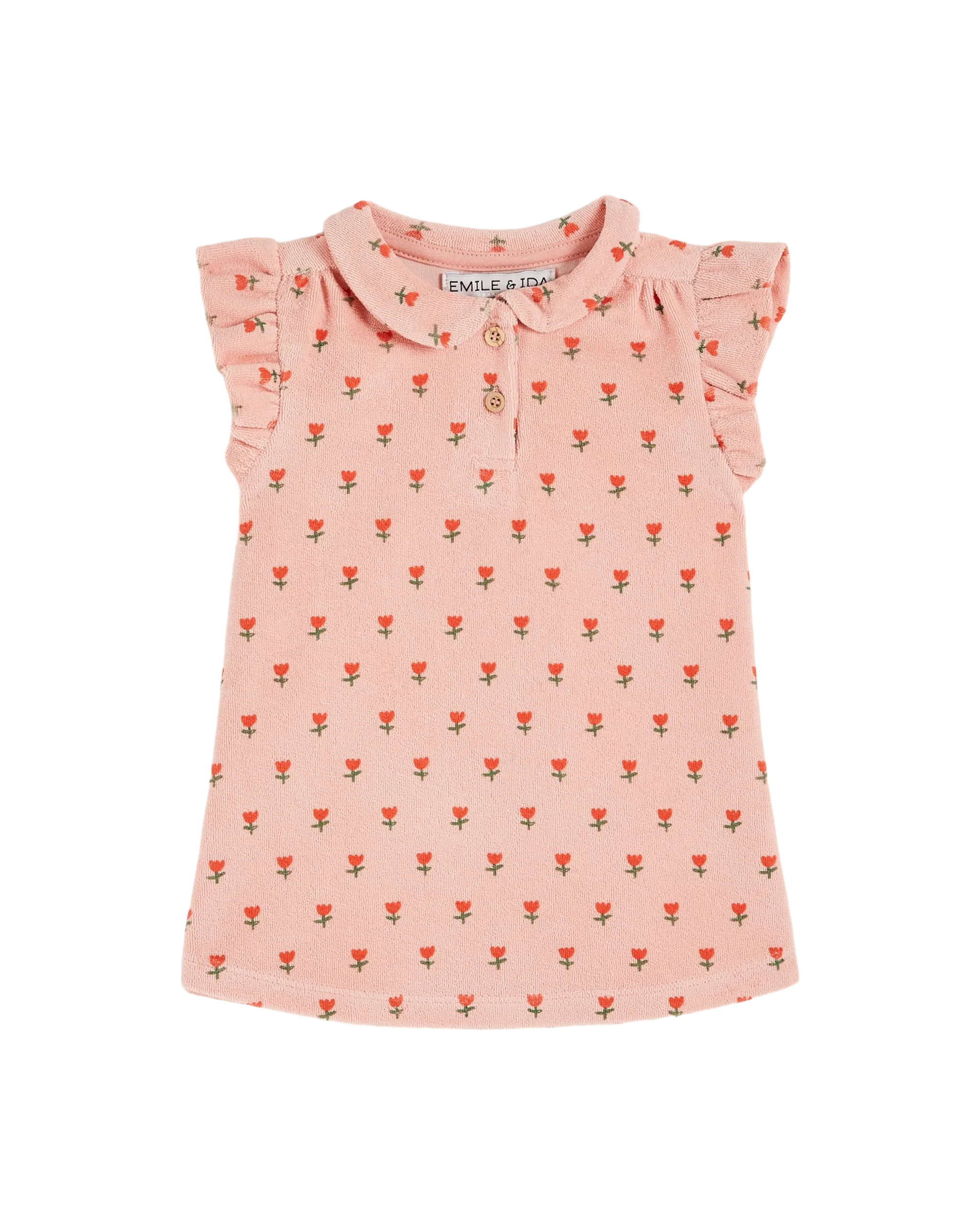 Pink terry dress printed with tulips and vermilion-red petals. You’ll love this soft, fluffy and comfortable terry velvet dress. The sleeves are replaced by charming gathered ruffles, while the flared shape and plunging, liquette-like hem add a touch of elegance. The Claudine collar nicely finishes the round neckline, and an opening with two wooden buttons on the front makes it easy for baby girls to put their heads through.