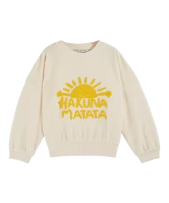 Ecru terry sweatshirt. Crafted in ultra-soft, plush, stretchy terry velvet, it offers unrivaled comfort. A sweatshirt with tonal ribbing at the cuffs, around the neckline and at the hem, long sleeves with offset armholes. Back from Africa, we wanted to share this sunshine and the well-known Hakuna Matata (what a wonderful phrase!), in yellow loop embroidery, with you.