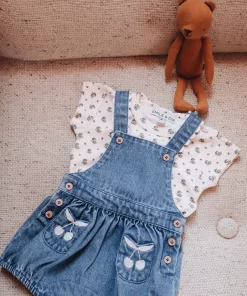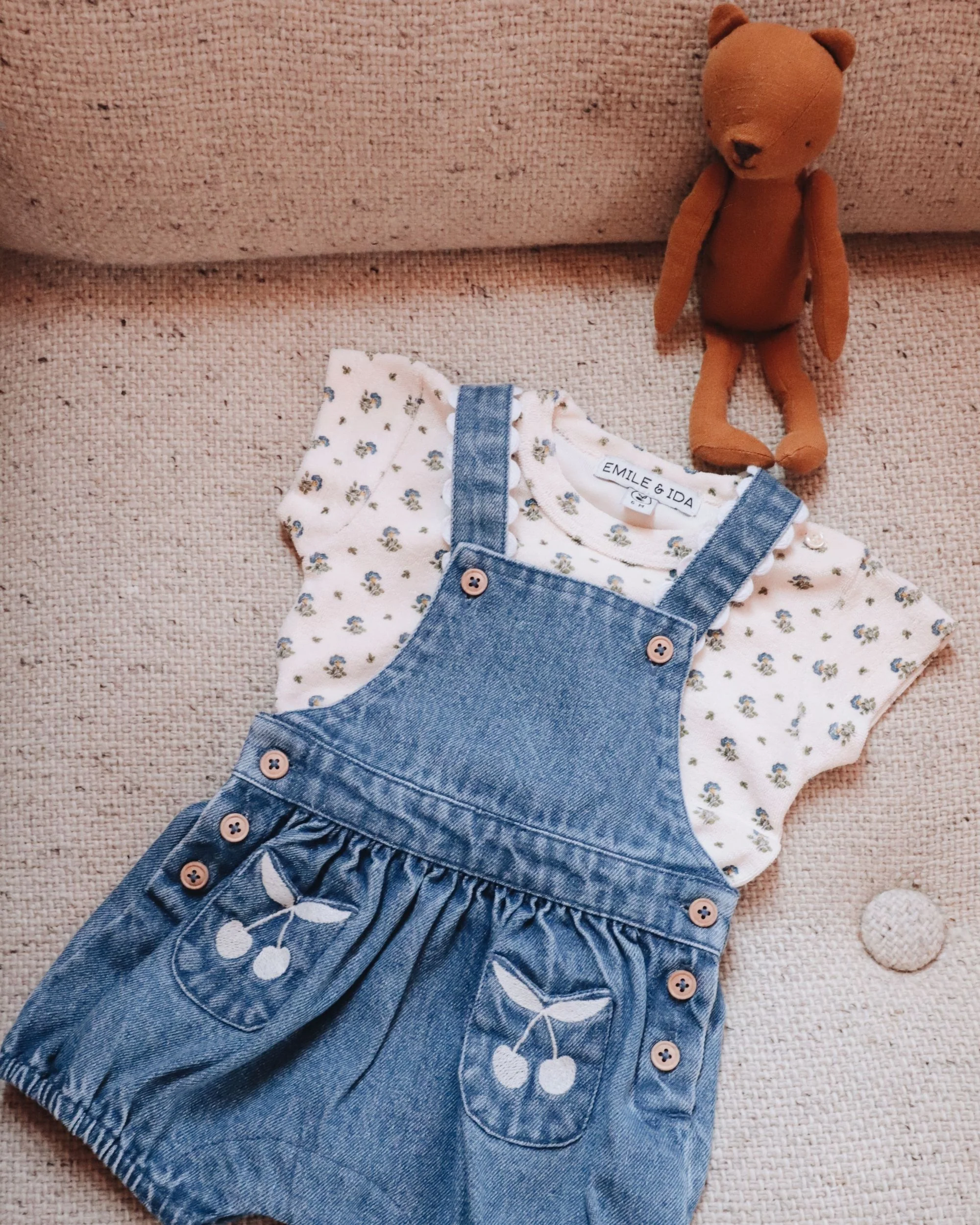 Cream terry T-shirt with vermilion-red tulips. Made from ultra-soft, plush and stretchy terry velvet, it offers unrivaled comfort. Crew neckline, stitched hems and short sleeves. An opening on the shoulder closes with tone-on-tone buttons, allowing the head to be passed over without tearing off the little treasure’s nose or ears.