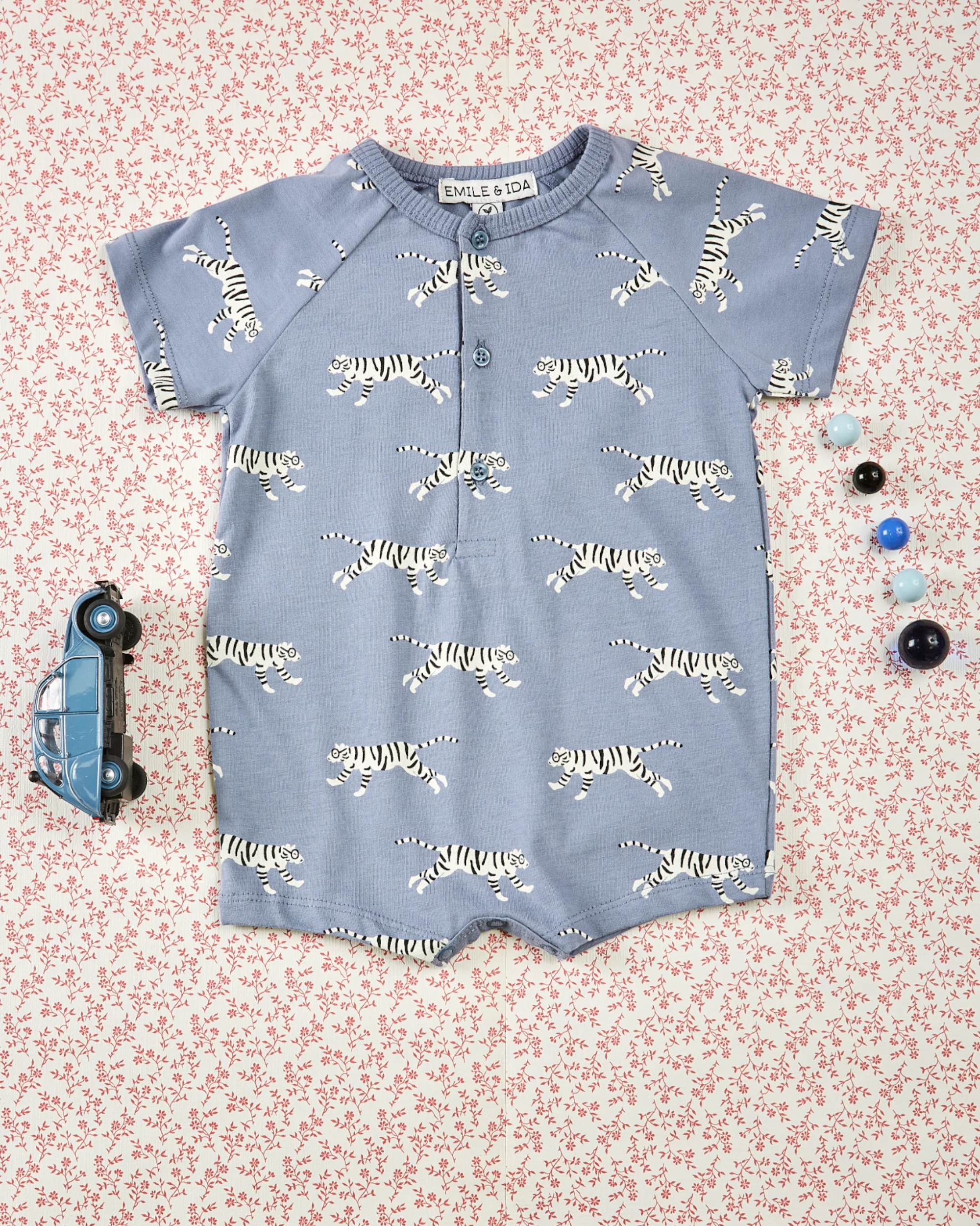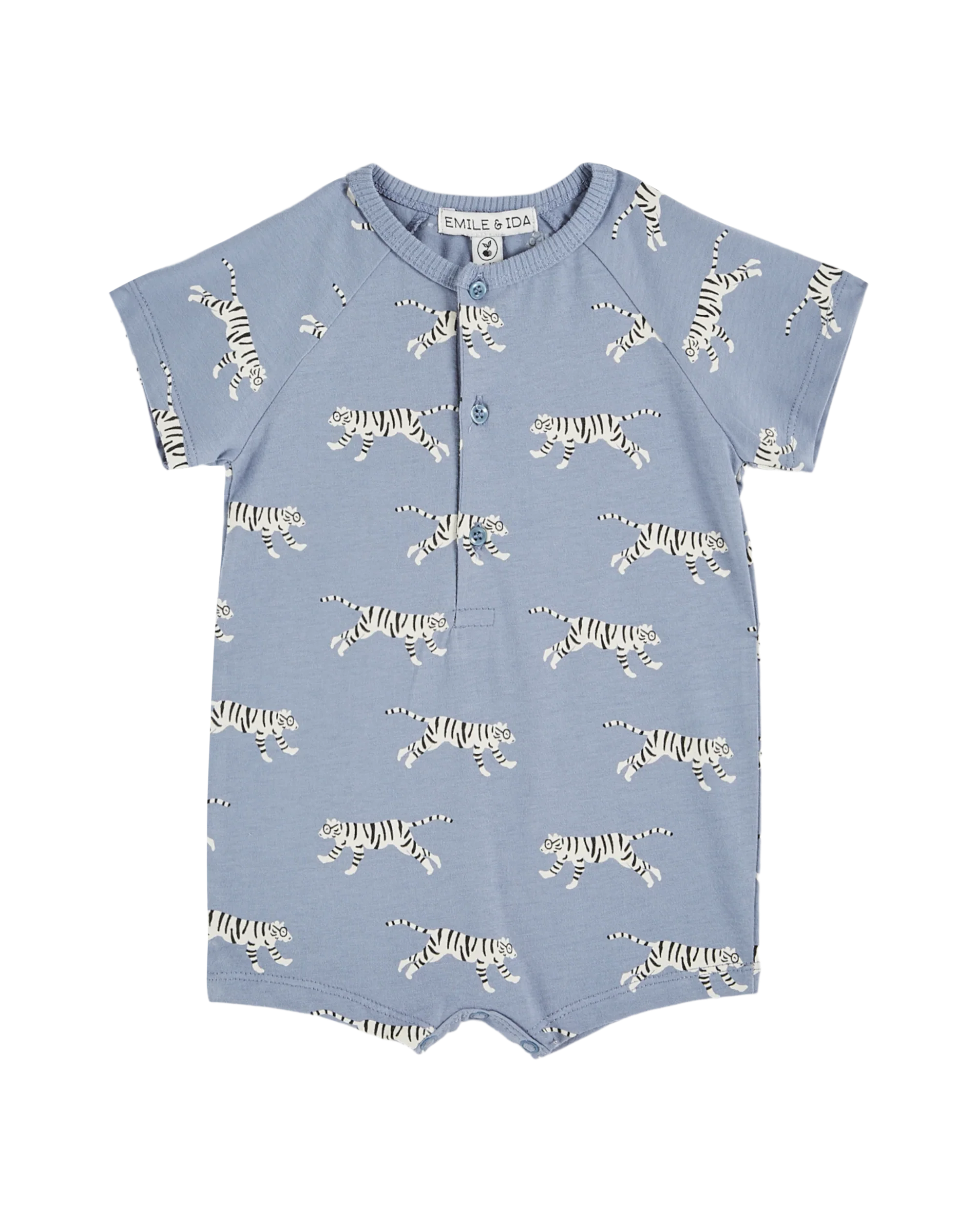 Romper in lavender-blue organic cotton jersey, adorned with a fun print of myopic white tigers. This lovely combicourt is made from soft, stretchy organic cotton. We love the tonal rib trim on the crew neckline, the button placket with natural mother-of-pearl buttons for easy dressing without snagging noses or ears, and the short raglan sleeves. Three crotch snaps make diaper changing as quick and easy as child’s play.