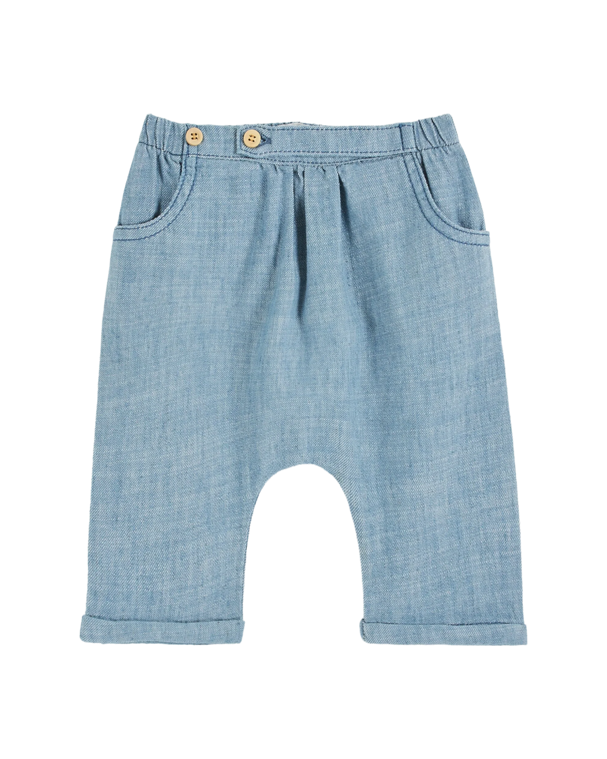 The soft, supple, lightweight fabric is ideal for wearing in warm weather. The hypoallergenic, breathable linen is perfect for sensitive skin, offering freshness and comfort while avoiding irritation. The pants are sarouel-shaped, with an elasticated waistband at the back and a gathered waistband at the front. This loose fit is perfect for babies’ chubby little bottoms. They feature two rider pockets, a cuff at the bottom of the legs and a tab added to the waistband to adjust the waist.