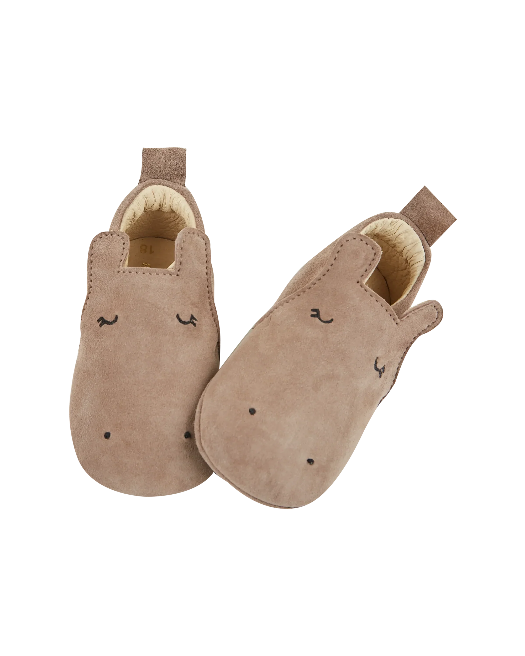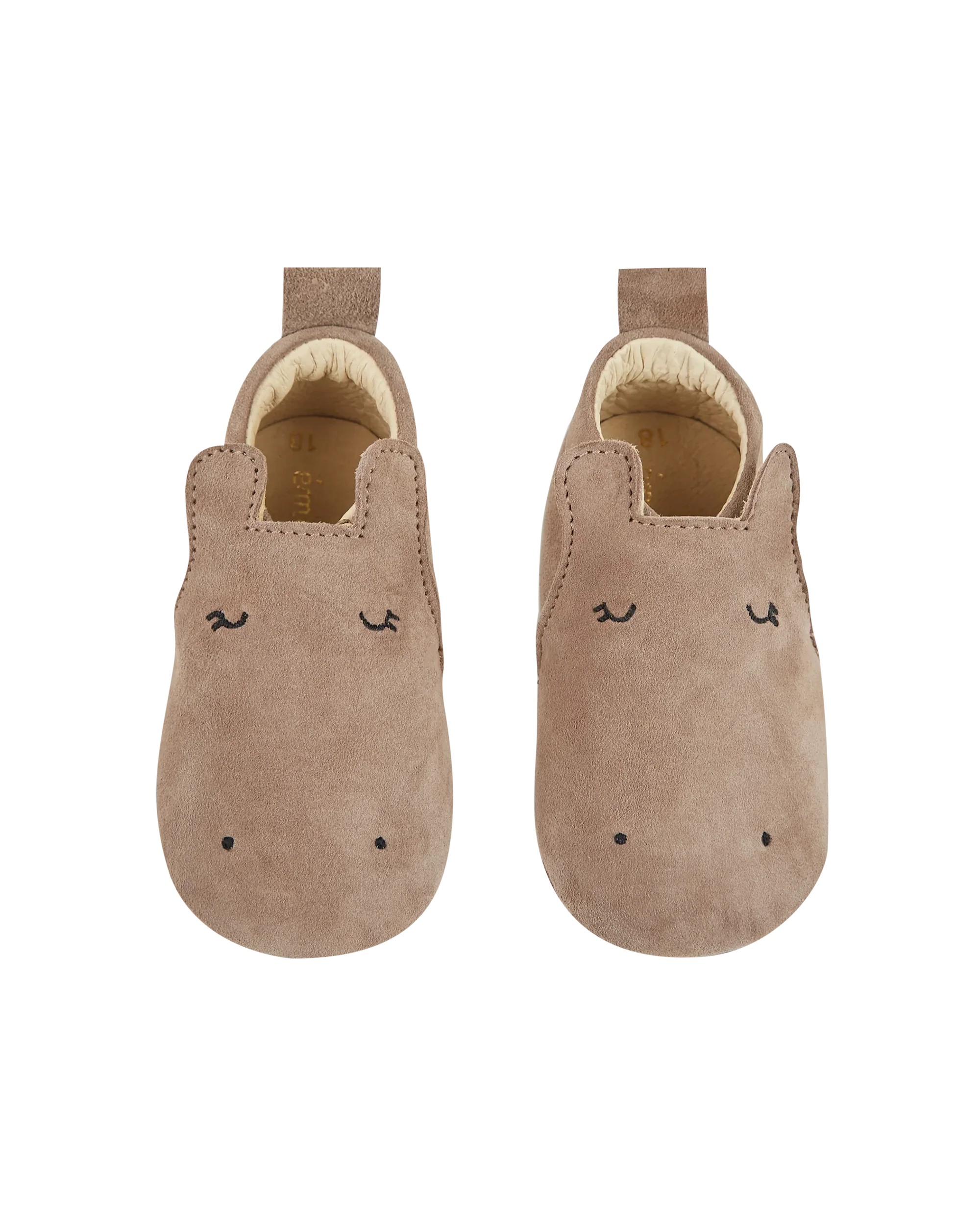 Hippopotamus slippers in mastic suede leather. At Emile & Ida, we don’t put shoes on babies, we disguise their feet with charming, supple, fully leather-lined booties, with an elasticated tongue and a pull tab at the back for easy slip-on. We love the nostrils and eyes embroidered on the vamp and the ears that hear all the secrets but know how to keep them.