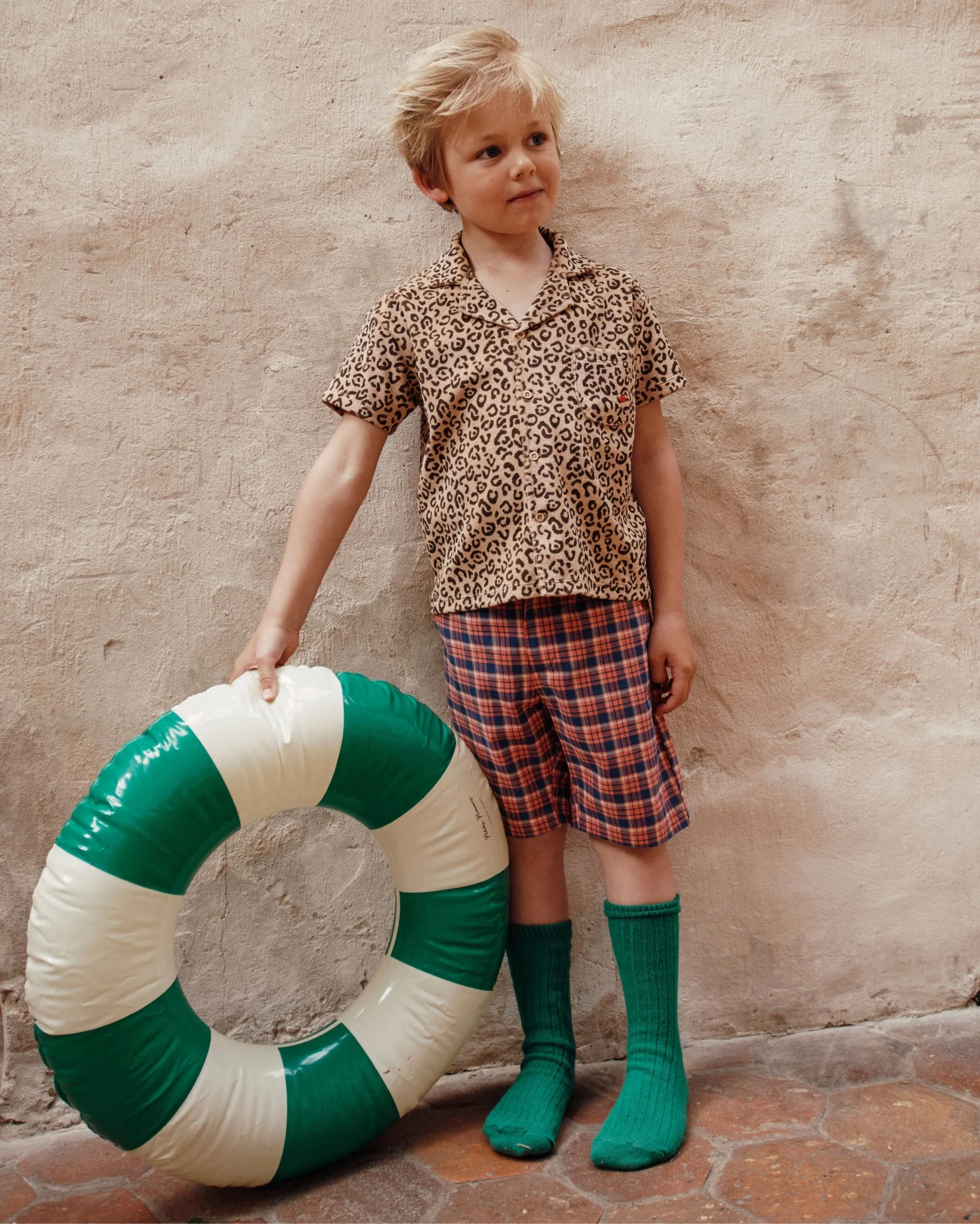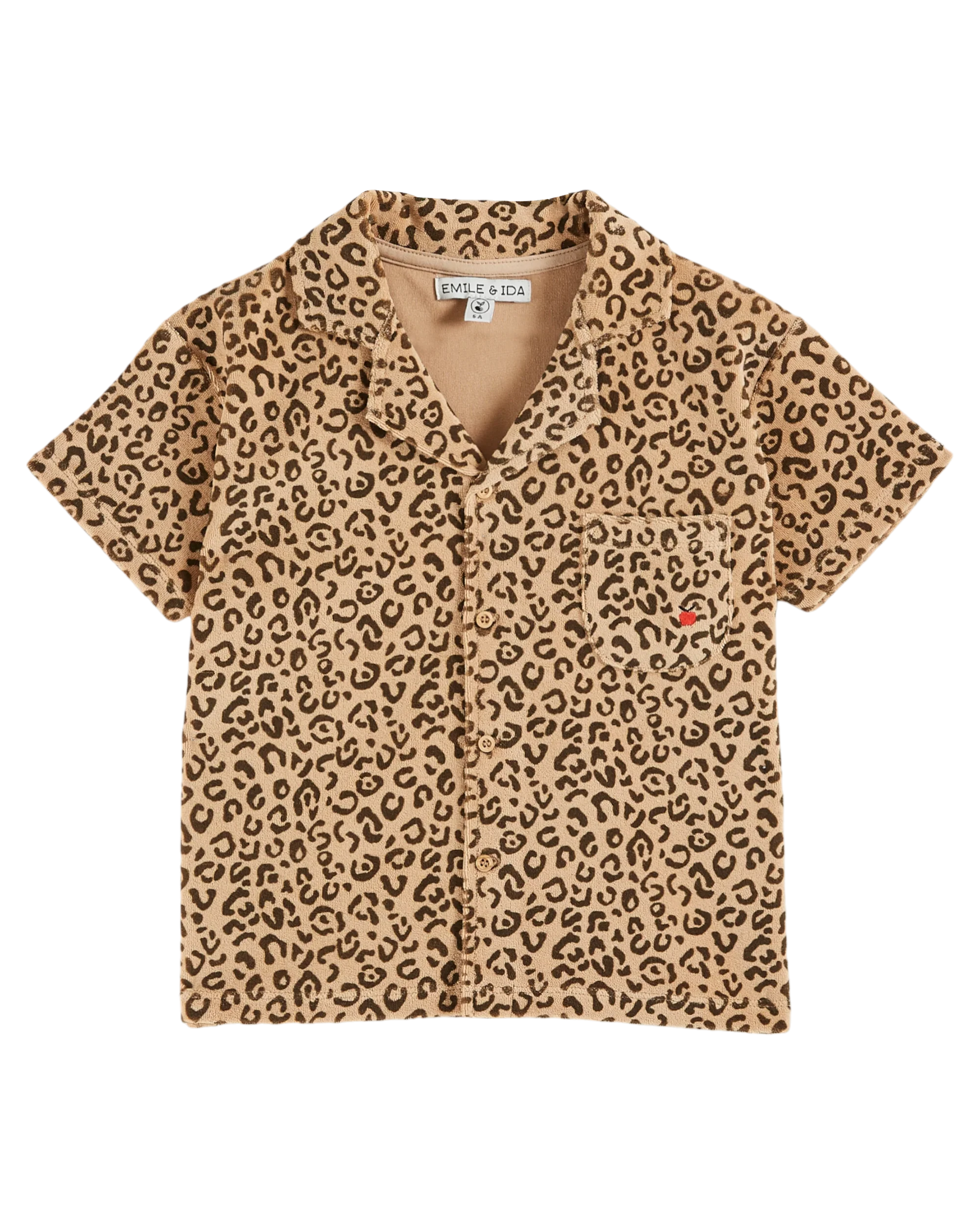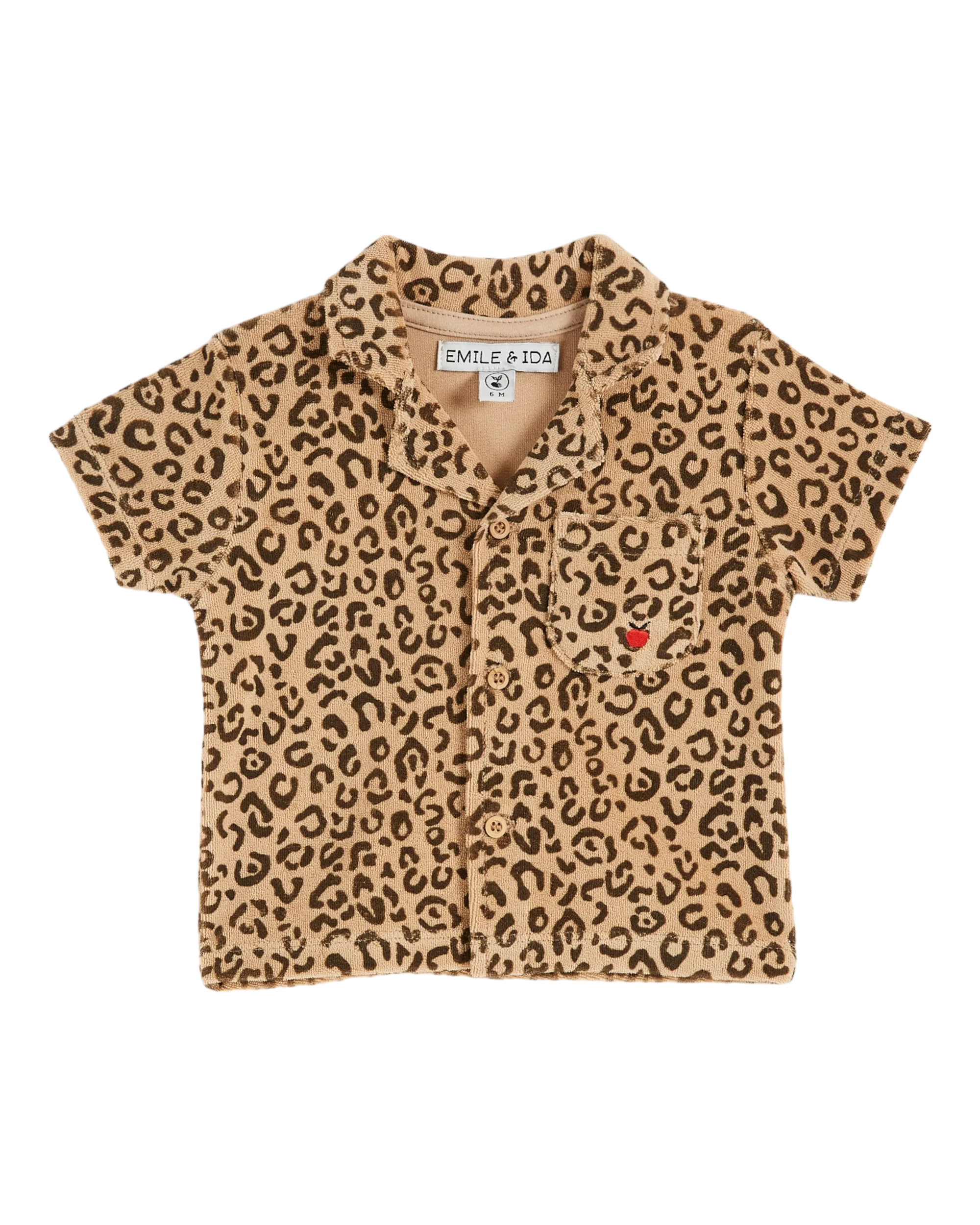 Short-sleeved blouse in caramel terry, printed with leopard ocelli. It features a small tailor collar, two short sleeves, a chest pocket adorned with a small embroidered red apple, and wooden buttons that close the blouse all the way up for optimum comfort. Crafted in ultra-soft, plush, stretchy terry velvet, it offers unrivaled comfort.
