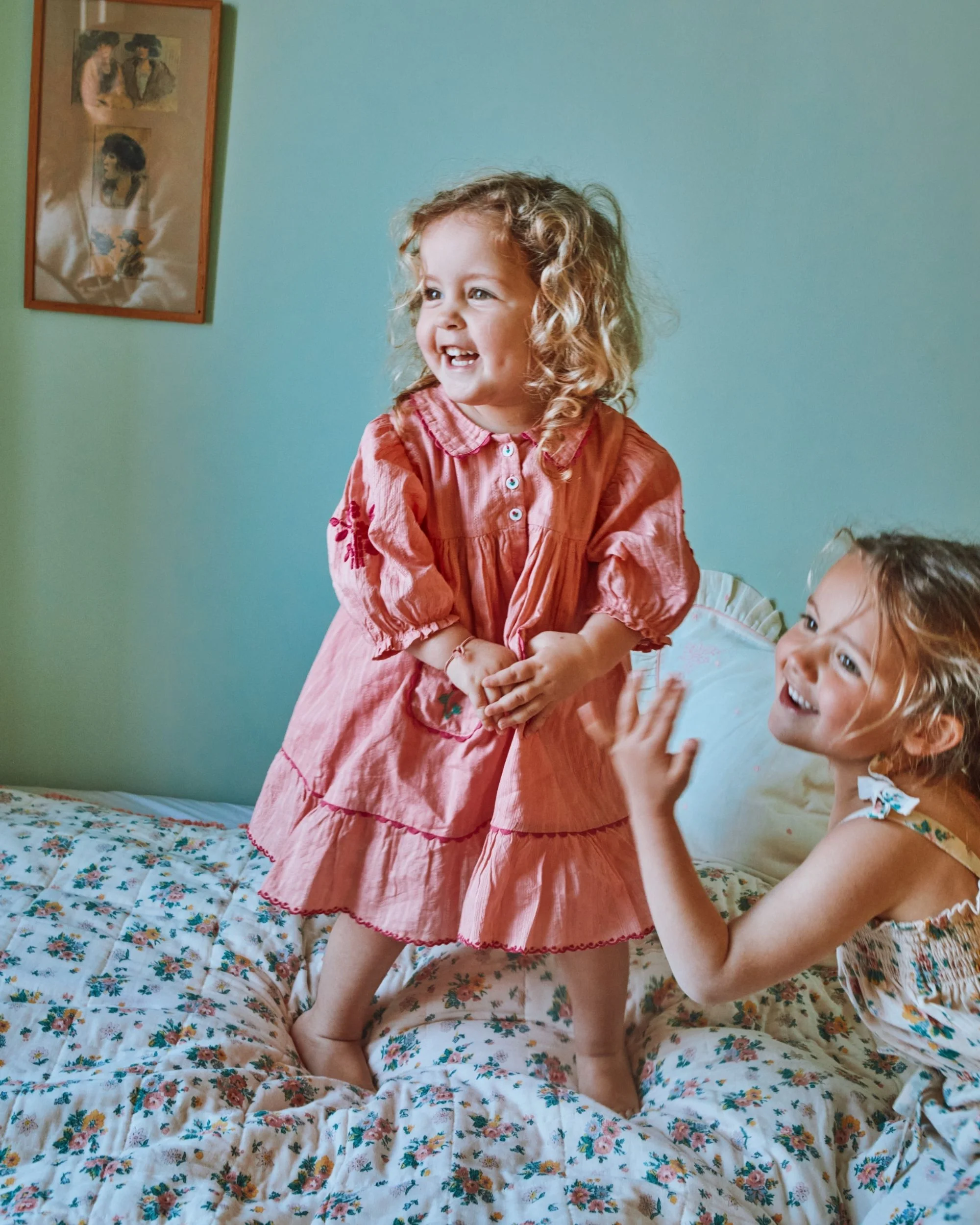 Hand-embroidered pink flowers and English seams extend the life of this fully lined dress.