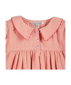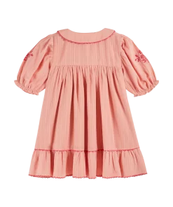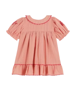 Pink Dobby cotton dress with matte and shiny stripes. You’ll appreciate the quality and fineness of the soft fabric, as well as the ample shape provided by the gathers. The balloon sleeves are elasticated with a ruffled effect at the bottom, and the flat collar is embellished with a dark pink croquet braid.