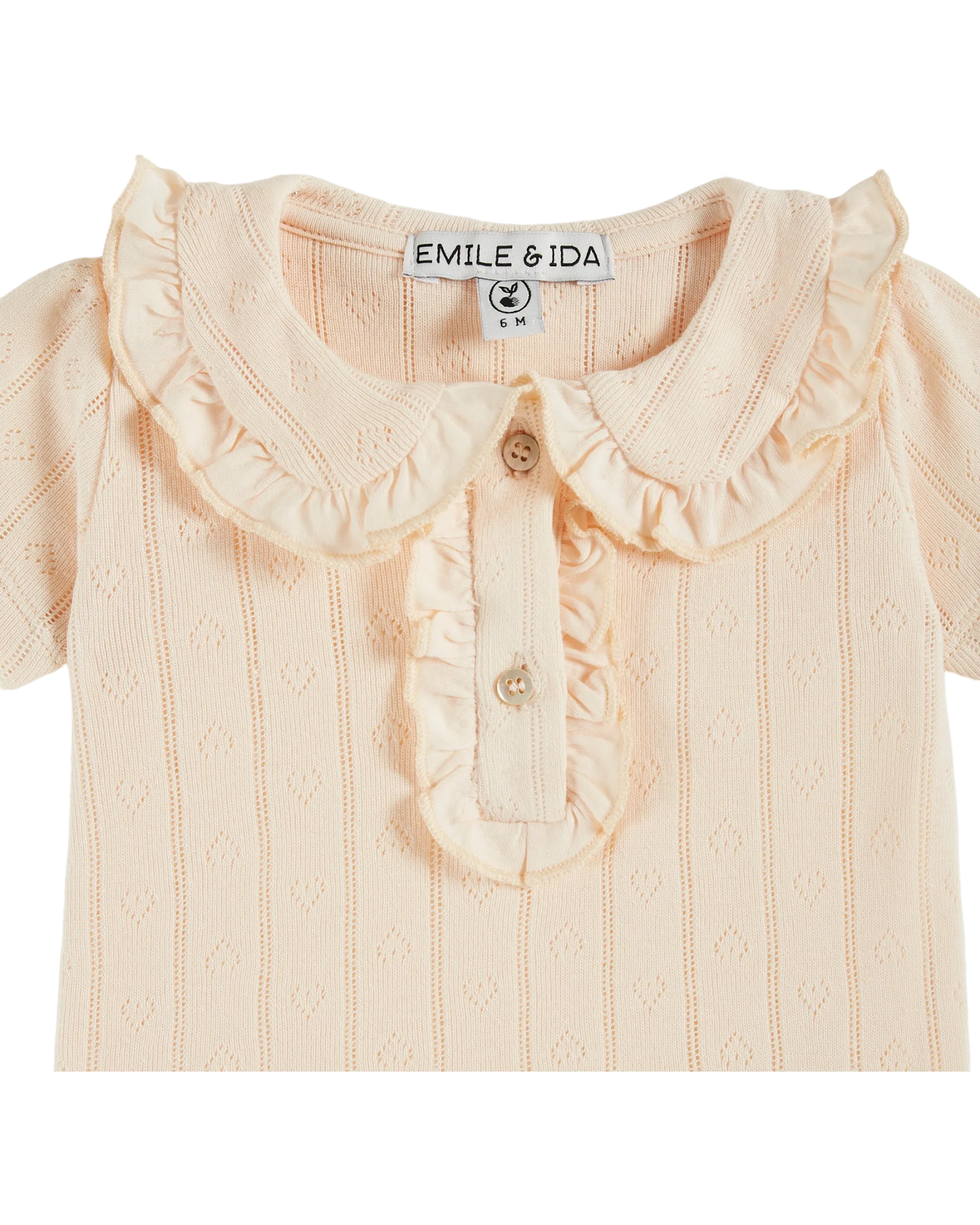 Polo shirt in cotton jersey and cream modal. Modal, a natural material, gives the fabric lightness and resistance to shrinkage after several washes, while maintaining long-lasting softness. Special attention to detail: a Claudine collar edged with a small ruffle, a button placket also embellished with a small ruffle, with natural mother-of-pearl buttons for easy donning and an all-over openwork fabric.