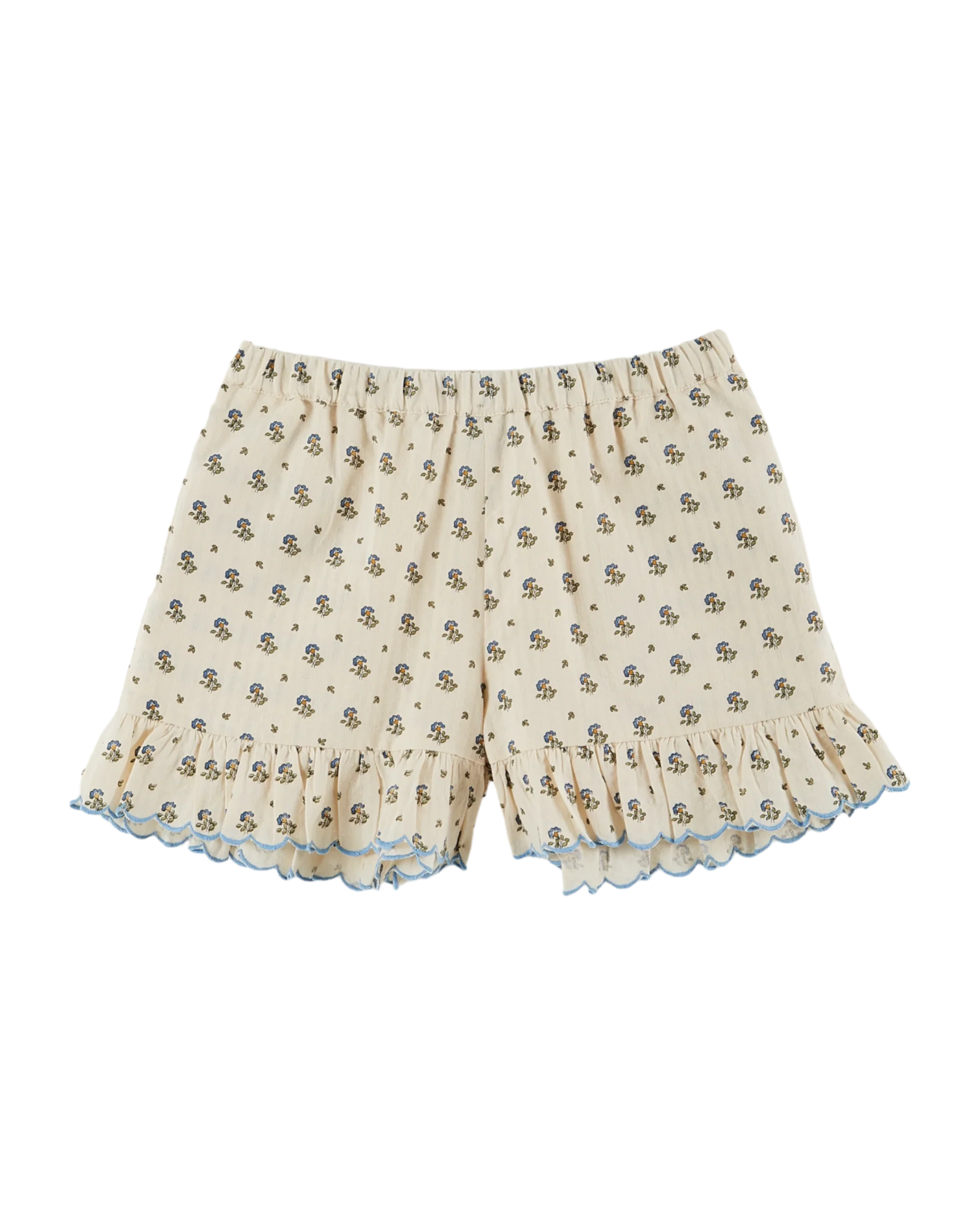 Off-white cotton shorts with floral print. The comfortable cut, soft colors and scalloped ruffle around the thighs, edged in blue, invite daydreaming while comfort encourages action. The shorts, mounted on an elasticated waistband, are fully lined, and two must-have seam pockets hold all the little girl’s little treasures.