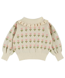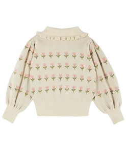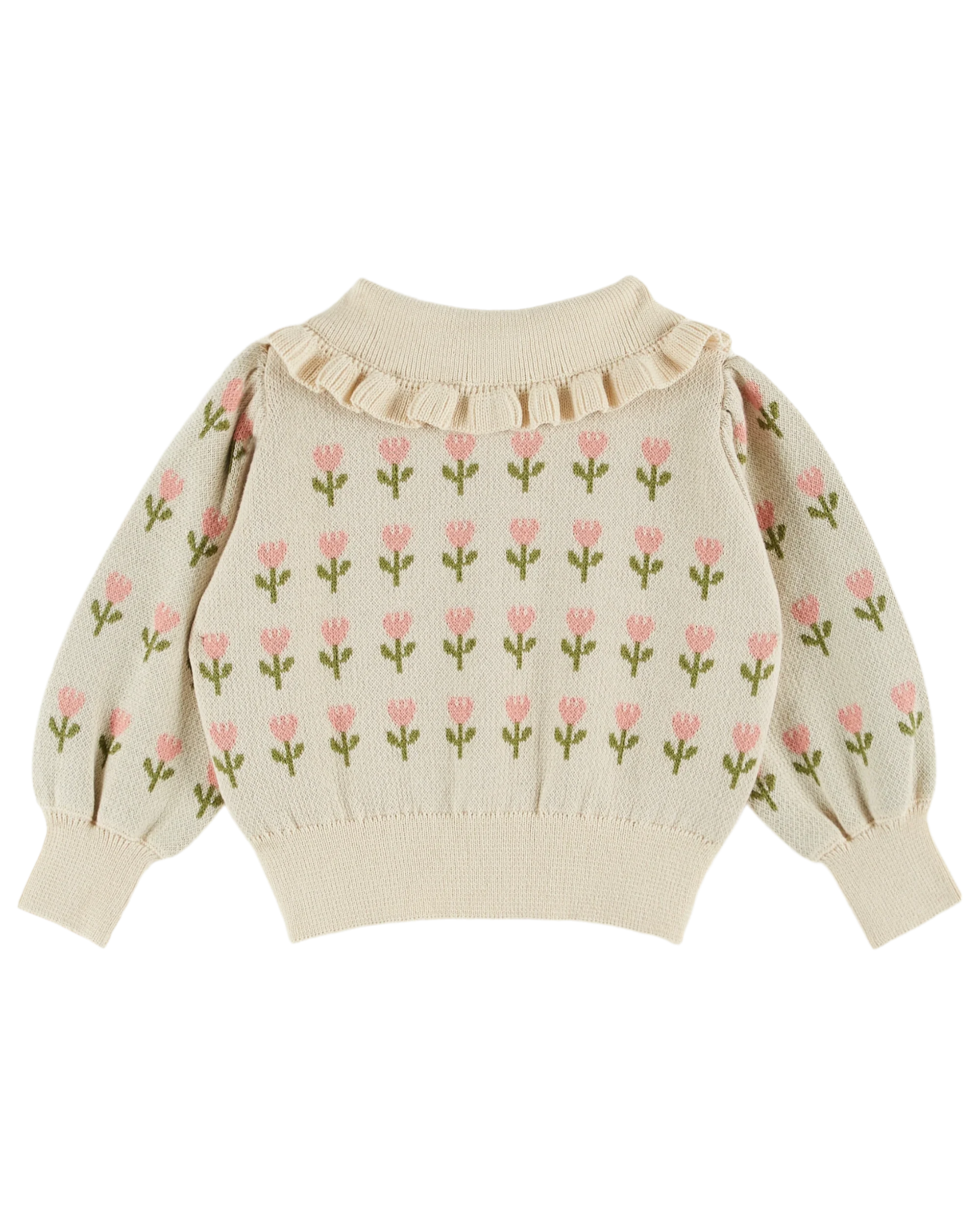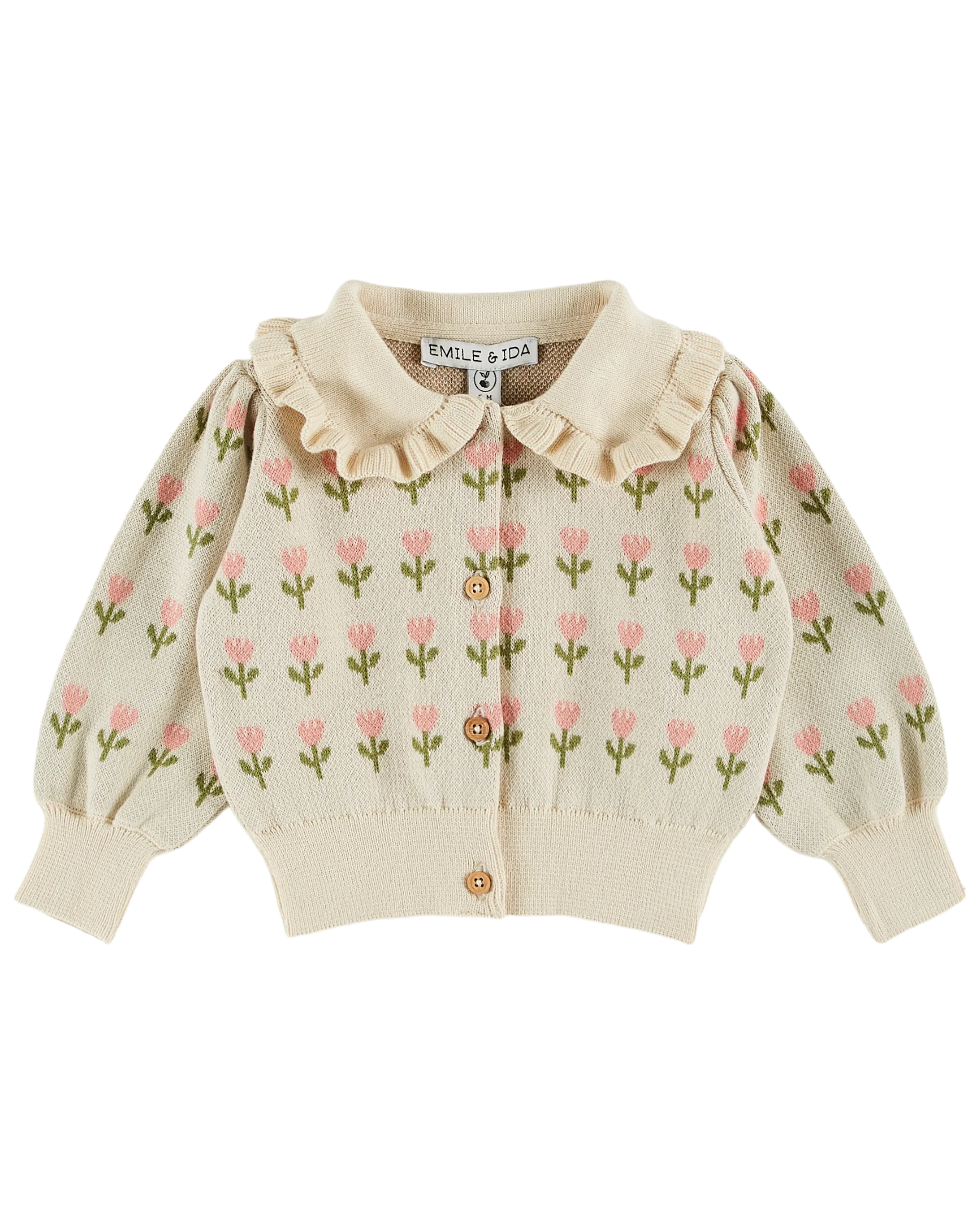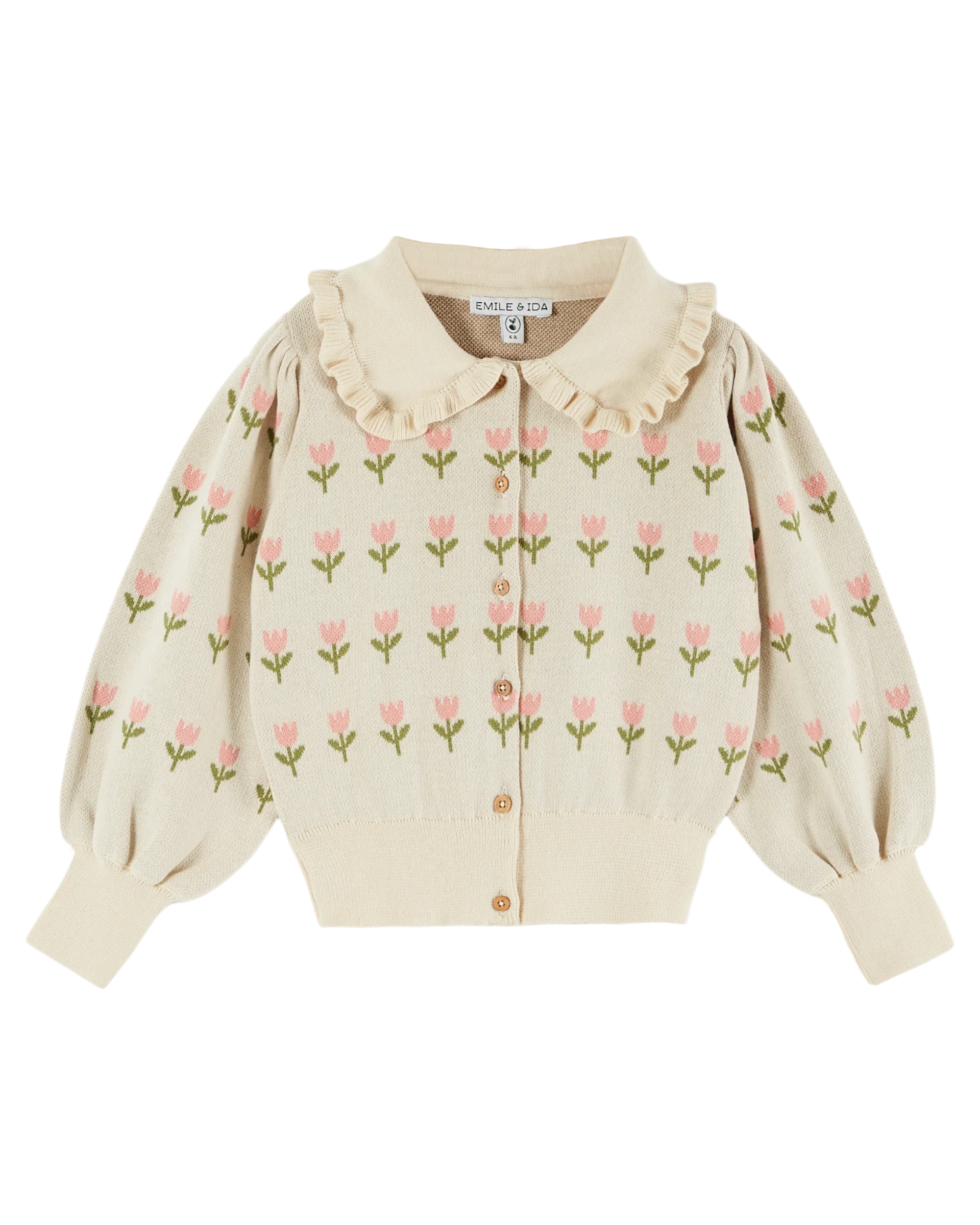 Intarsia jacquard cardigan in organic cotton adorned with pale pink tulips. This cardigan is knitted from soft cotton. It features long sleeves with a few flat pleats at the top, creating a puffed effect, and wooden buttons running the full height of the lined button placket. Tone-on-tone ribbing, in which elastic threads are woven, is added around the hem and cuffs. These little elastics ensure that the ribbing doesn’t loosen over time. Finally, the collar is knitted in jersey stitch and finished with a delicate frill.