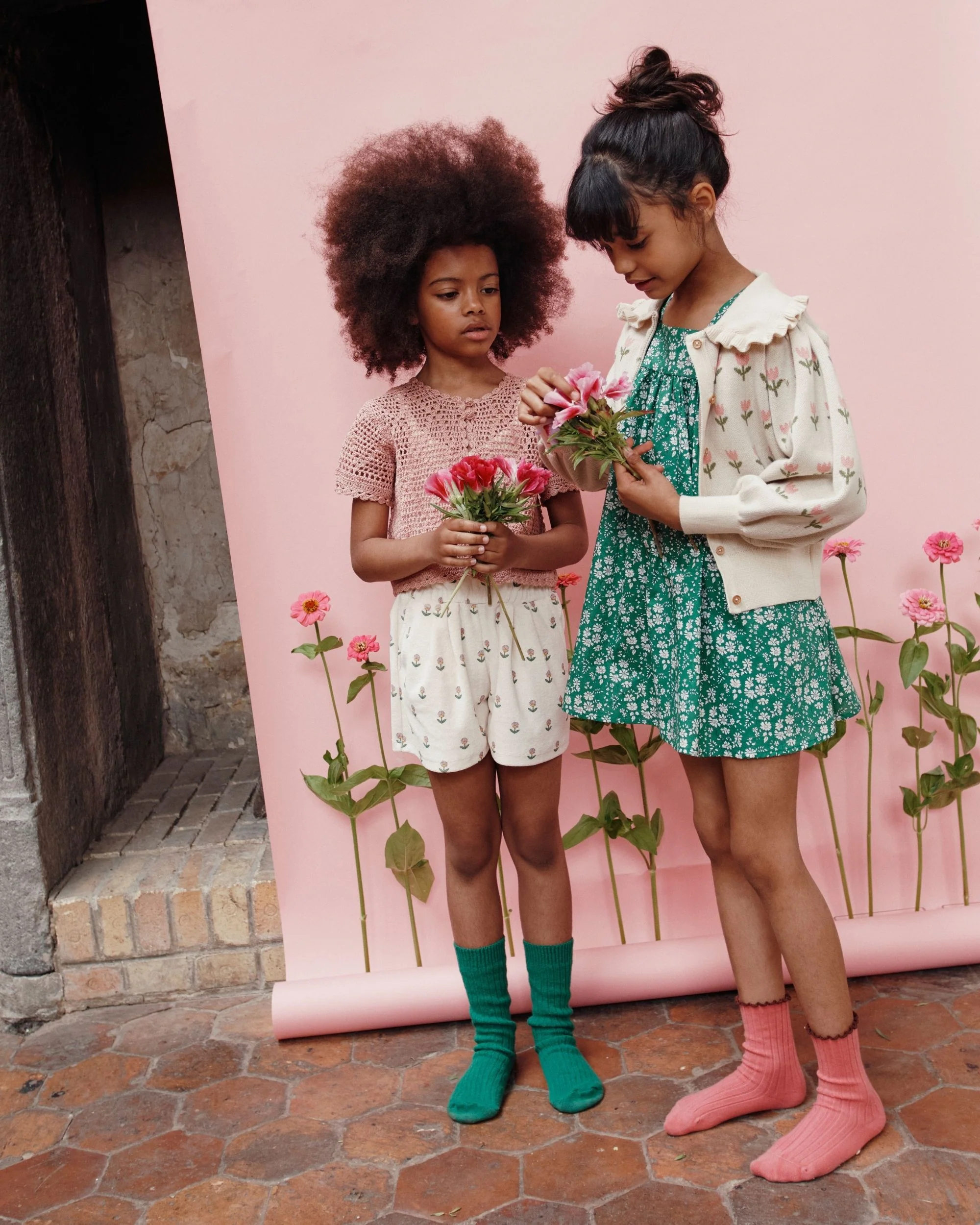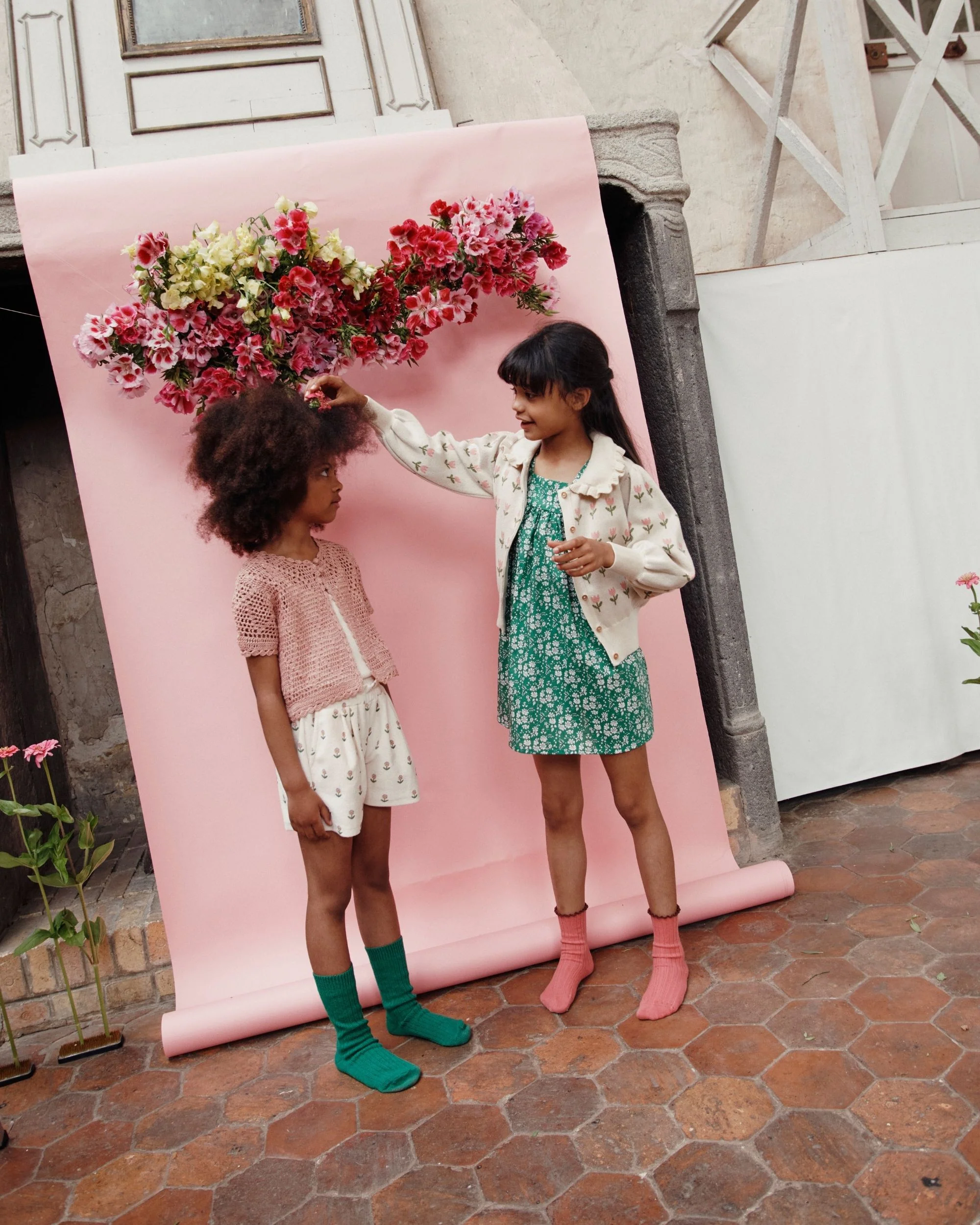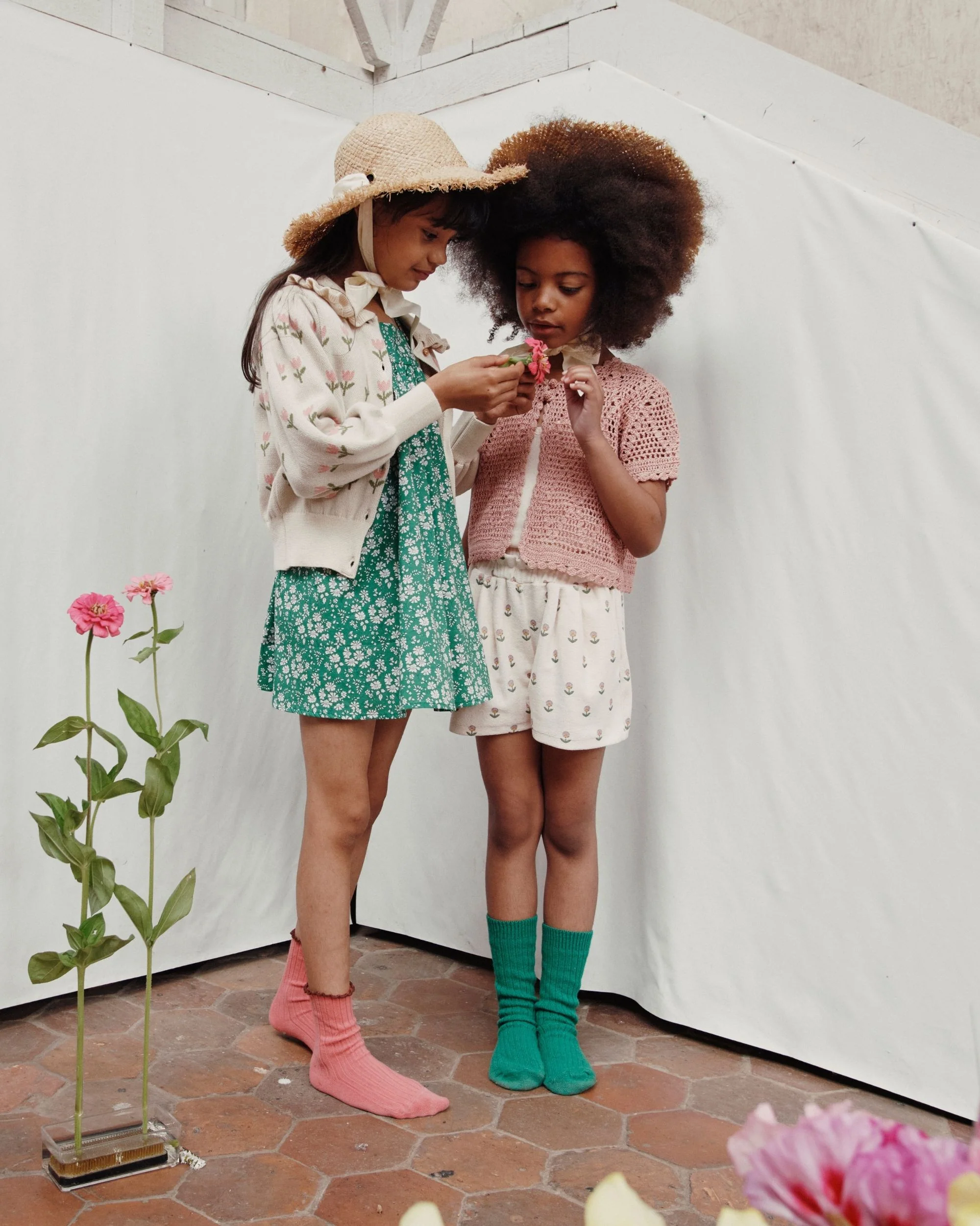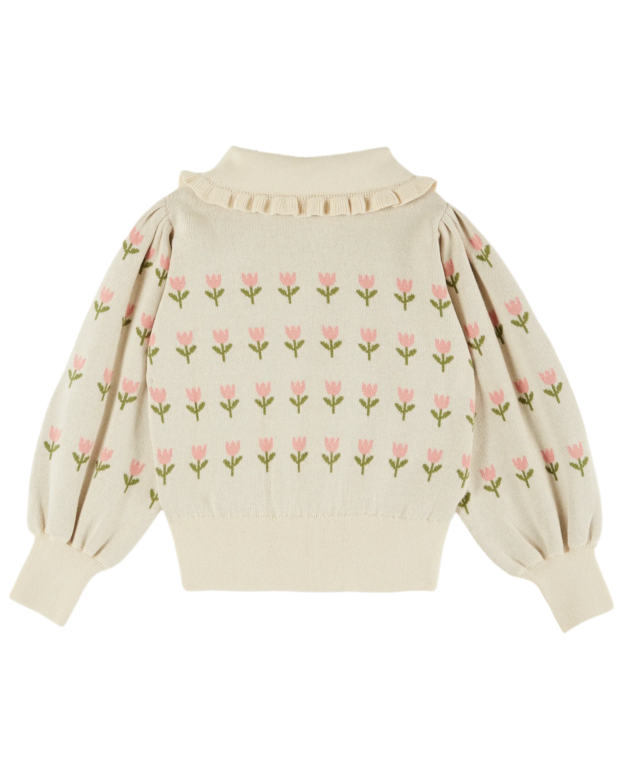 Intarsia jacquard cardigan in organic cotton adorned with pale pink tulips. This cardigan is knitted from soft cotton. It features long sleeves with a few flat pleats at the top, creating a puffed effect, and wooden buttons running the full height of the lined button placket. Tone-on-tone ribbing, in which elastic threads are woven, is added around the hem and cuffs. These little elastics ensure that the ribbing doesn’t loosen over time. Finally, the collar is knitted in jersey stitch and finished with a delicate frill.