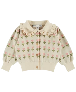 Emile et Ida Girl Jacquard Ecru Organic Cotton Ruffled Cardigan | Ecru