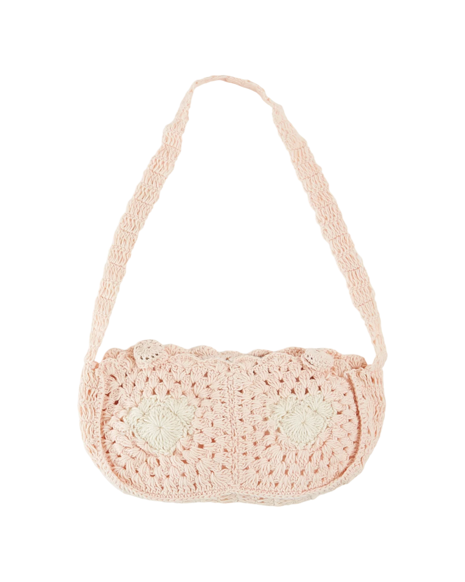 Mini baguette bag in pale pink crochet. A shoulder strap, a band for the gusset connecting four hand-crocheted squares, each adorned with an off-white heart at its center: all this makes up a delightful baguette bag. – Two-button closure – Entirely hand-crocheted Dimensions: 20 x 10 x 5 cm Shoulder strap length: 64 cm