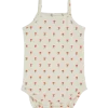 Strapless baby dress in fine pastel-blue cotton gauze, embroidered with small ecru all-over hearts. In the center of the yokes, between two garlands of green leaves, is a larger heart embroidered in cross-stitch. This light, flared dress is fully lined to compensate for the finesse and transparency of the material.