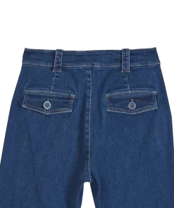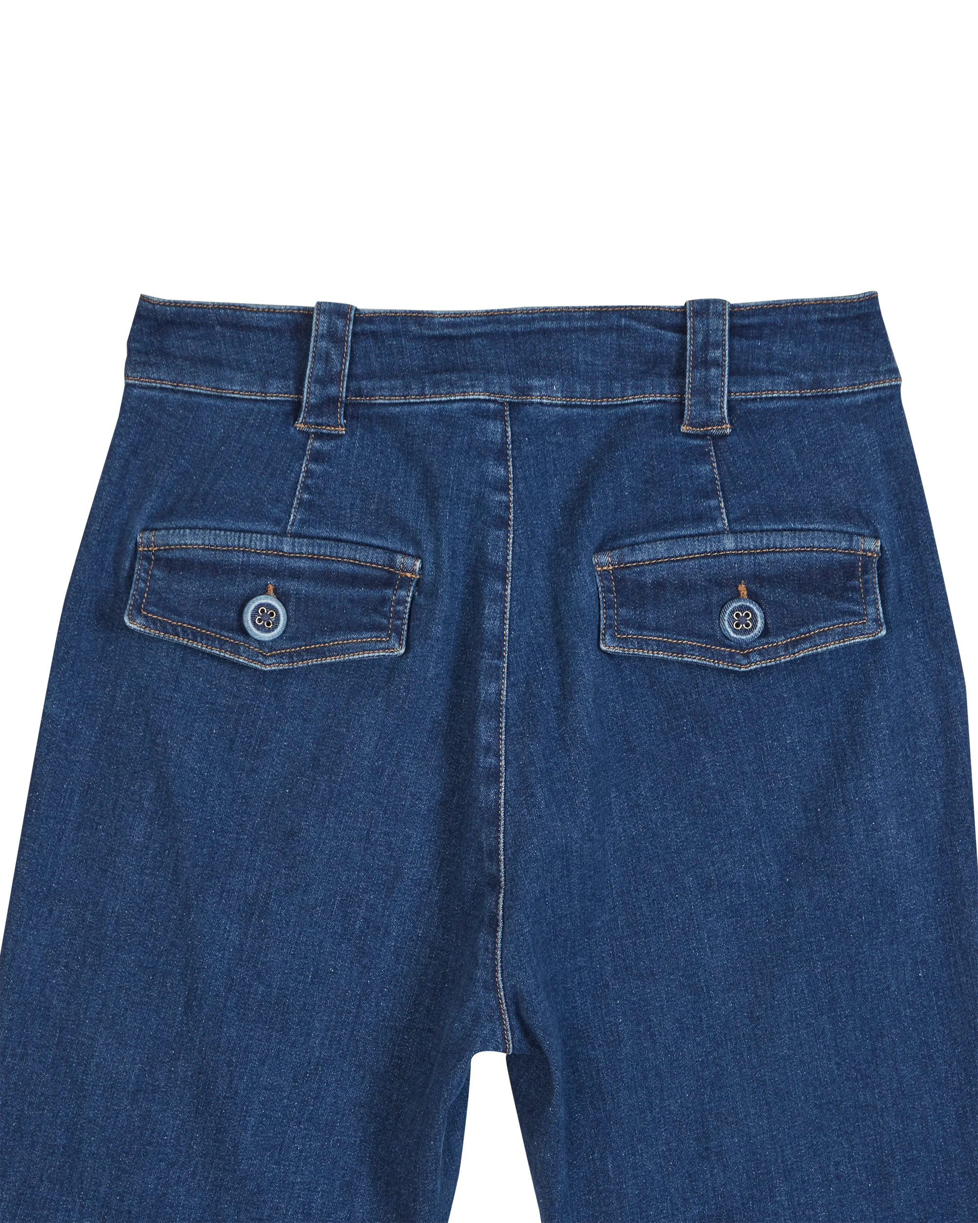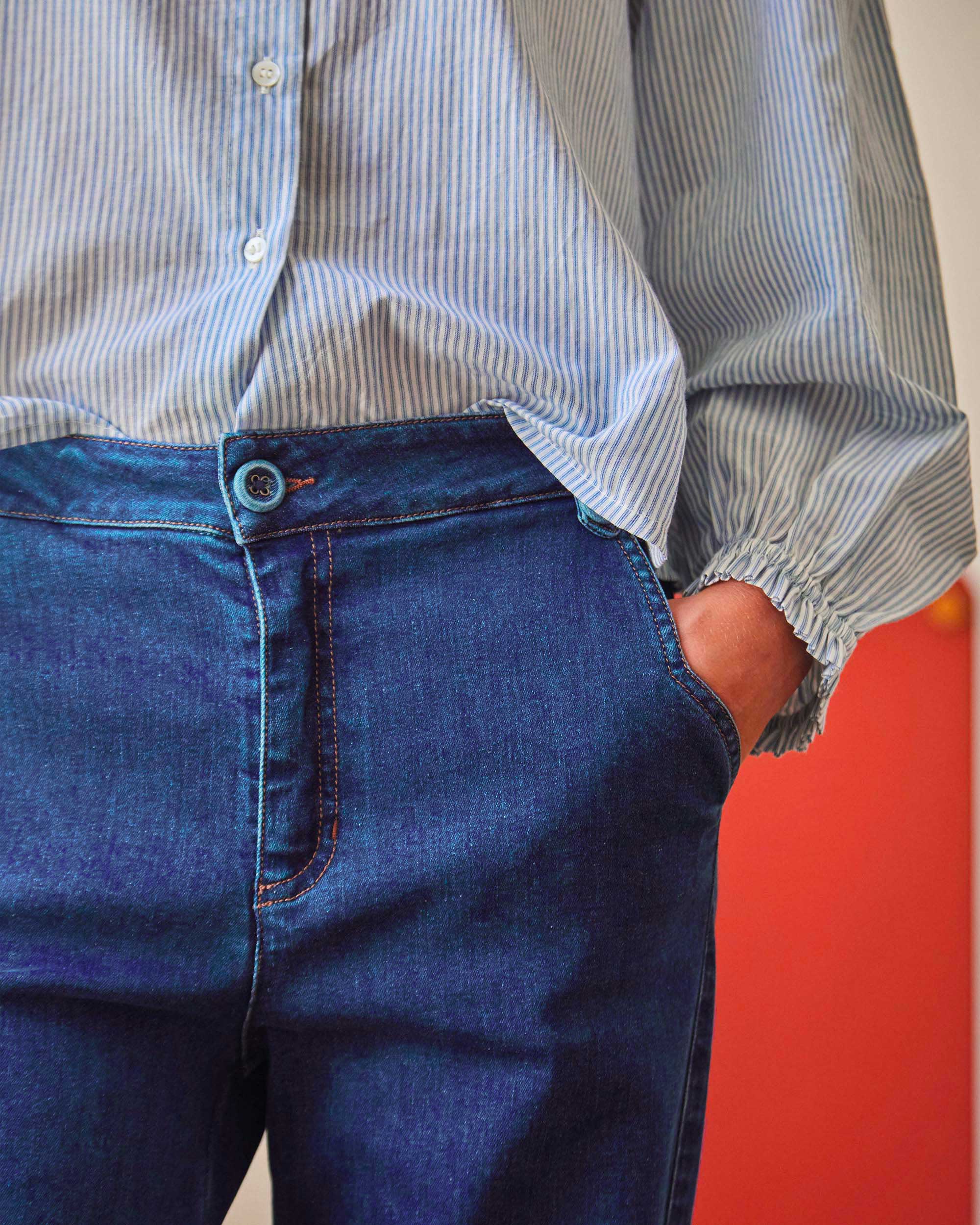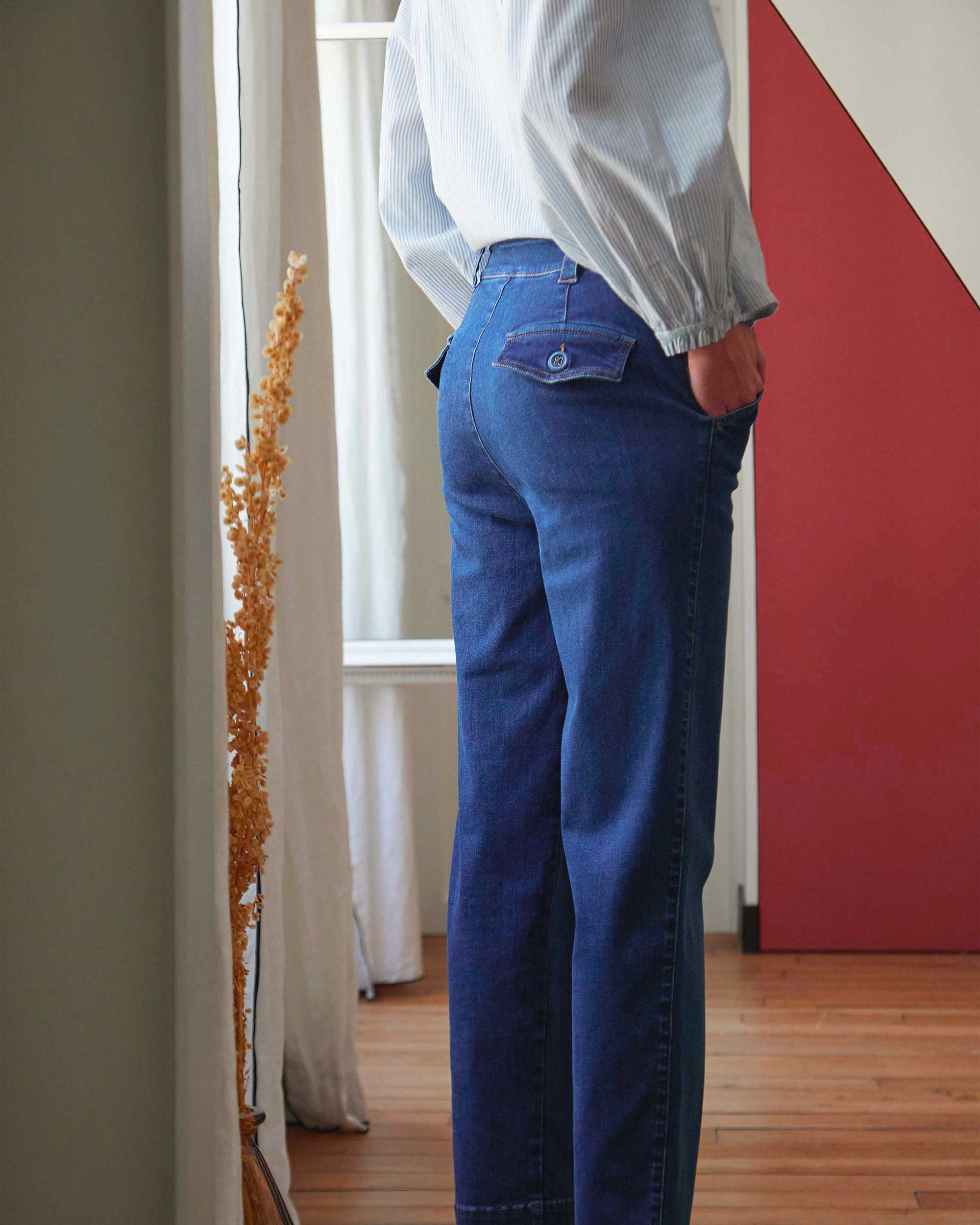 Straight-leg jeans in denim cotton and blue elastane. Thanks to the small amount of elastane mixed with the cotton, the fabric is supple and slightly stretchy, so it doesn’t restrict movement. A basic pair of jeans, belted at the waist, to which we’ve added a few fancy touches: pretty stitched cut-outs on the western pockets, flap pockets (in London or Paris) buttoned on the buttocks, wide loops adorned with denim-covered buttons to accessorize the waistband. The zip fastening at the fly is metal.