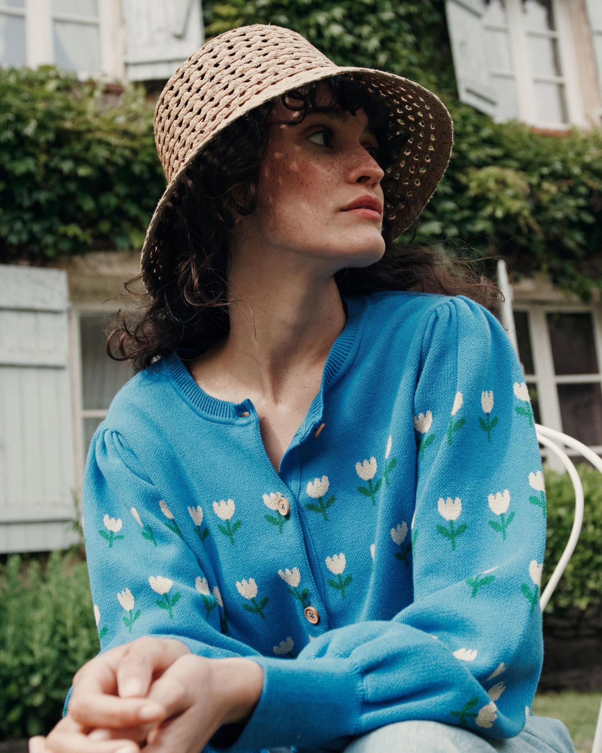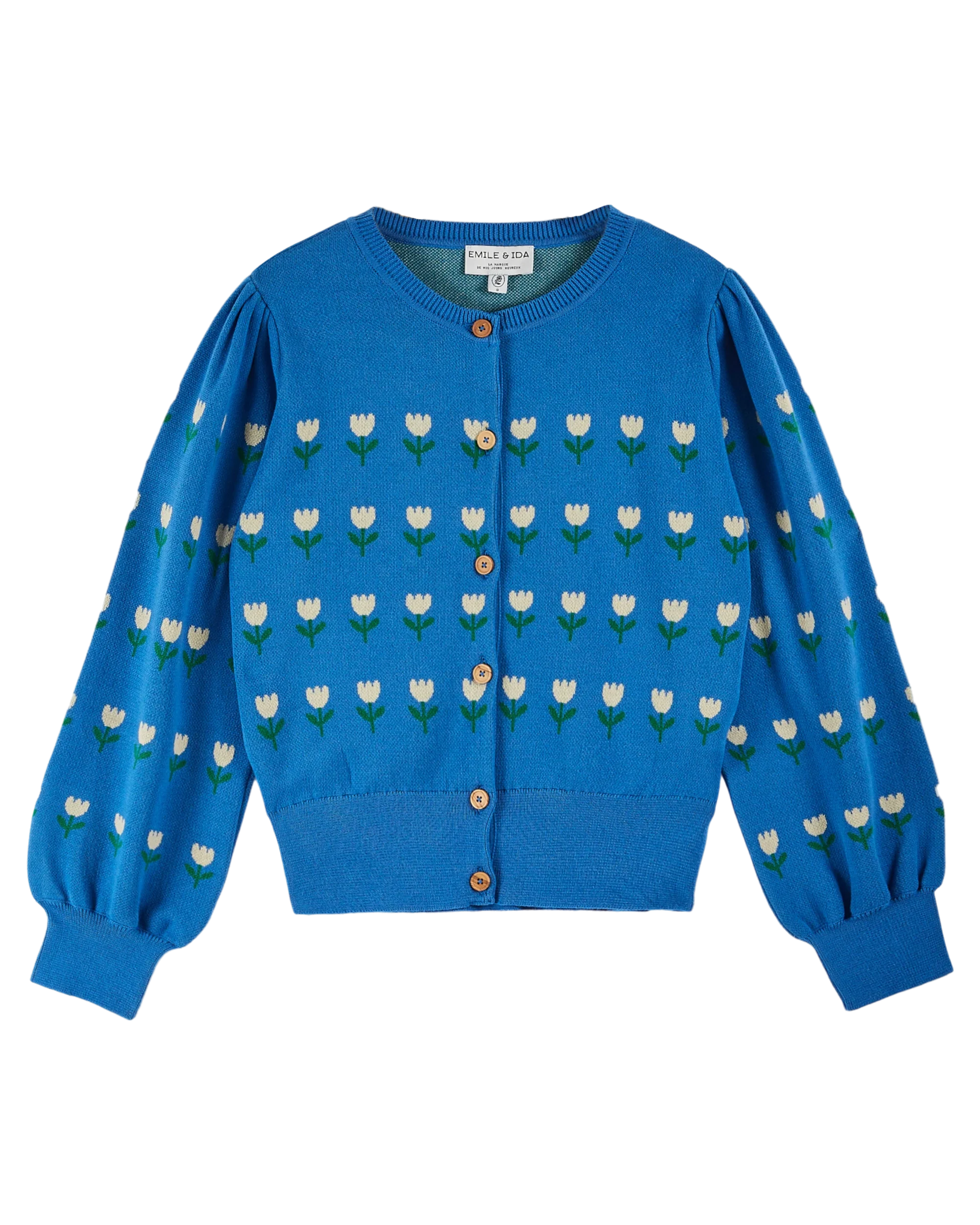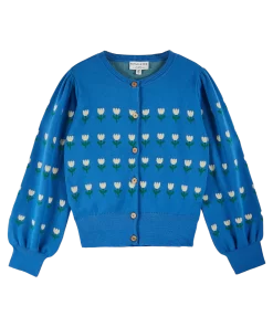 Intarsia jacquard cardigan in blue organic cotton, adorned with ecru tulips.