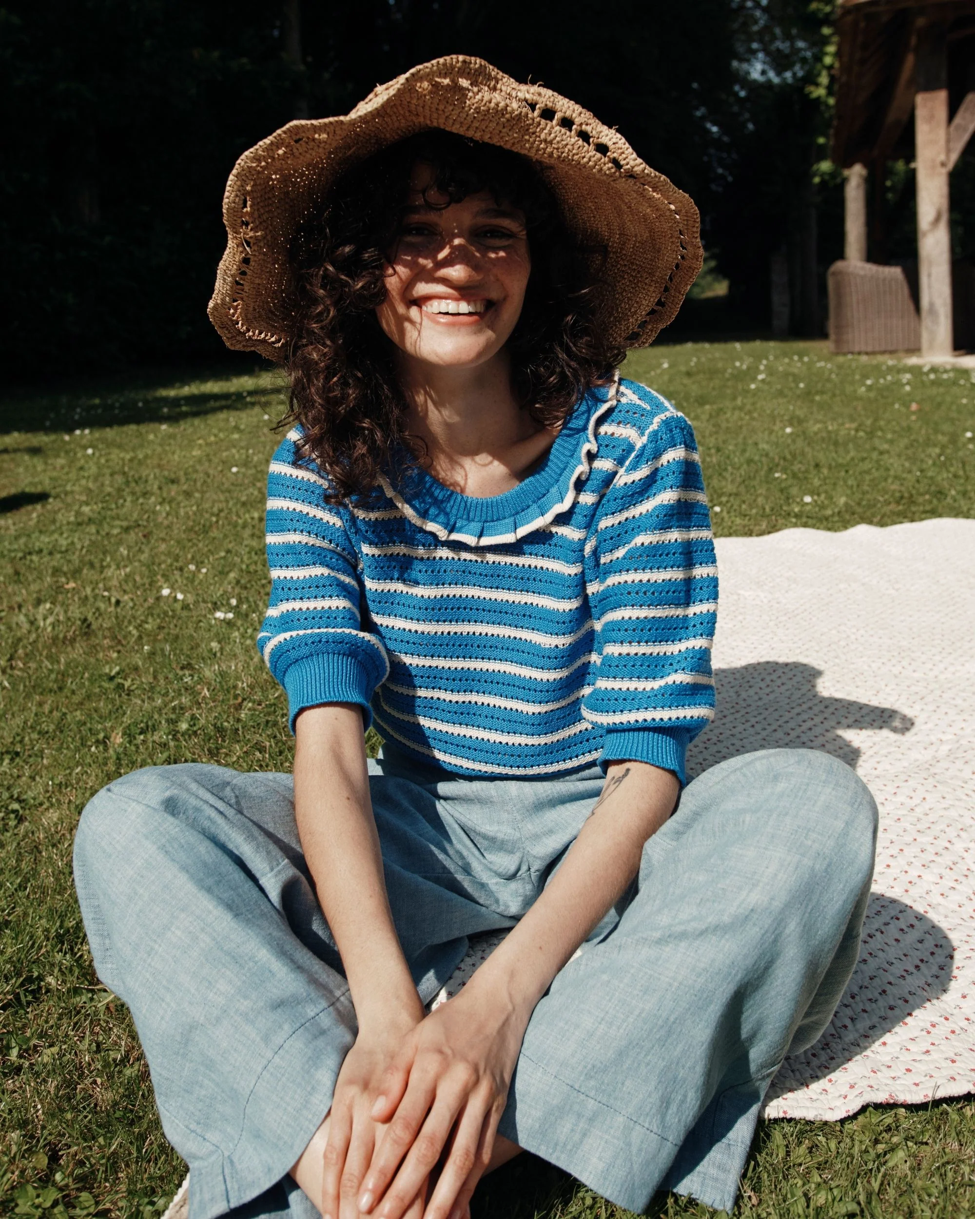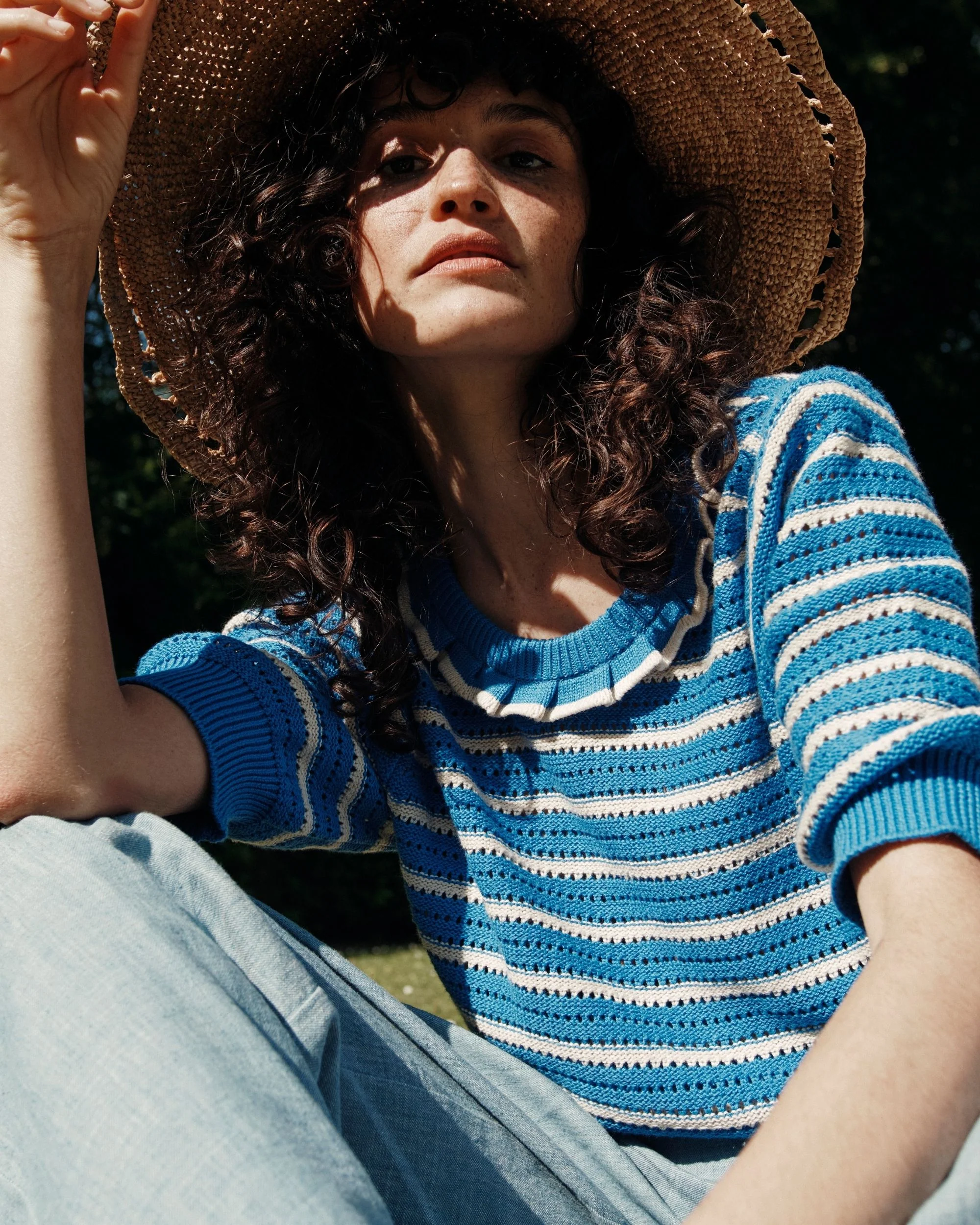 Short-sleeved sweater in blue cotton, accented with off-white lines. Knitted in reverse jersey, its neckline is embellished with a pleated ruffle, adding a subtle, feminine whimsy.