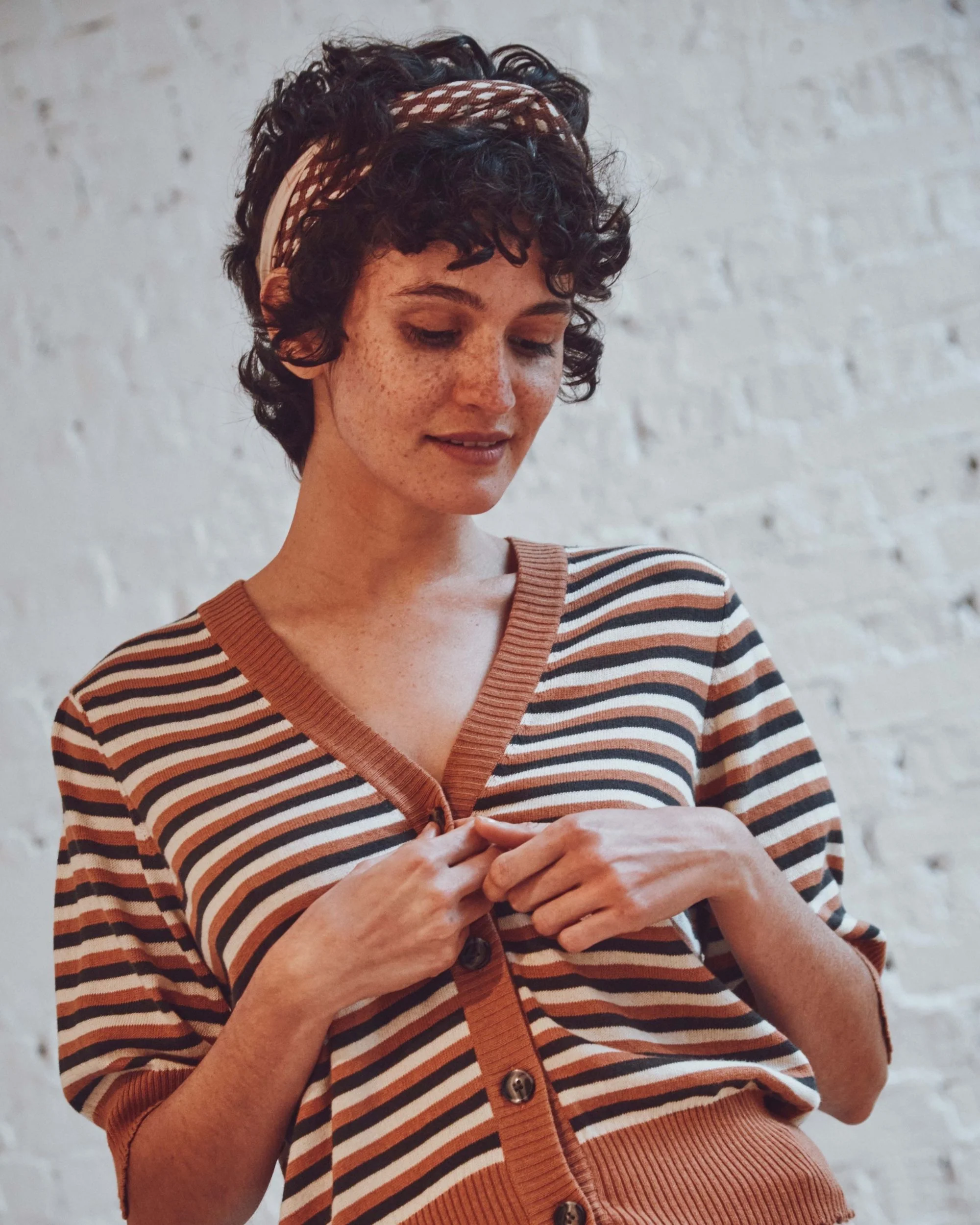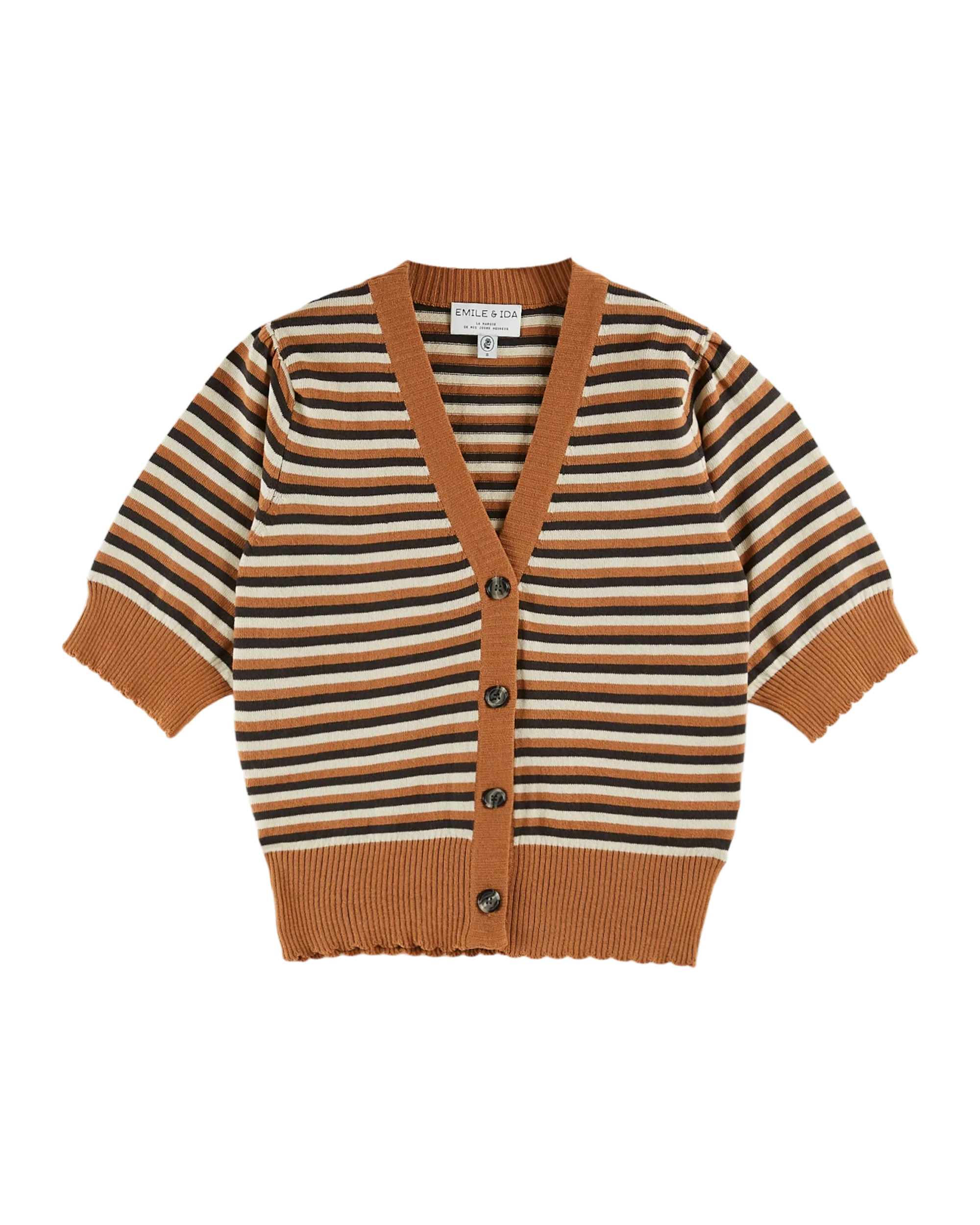 Short-sleeved cotton cardigan alternately striped with ecru, black and caramel lines. It is knitted in jersey stitch with a very fine cotton yarn, making this versatile cardigan. It can be worn as a t-shirt next to the skin or as a cardigan over a blouse. The V-neckline is trimmed with caramel ribbing, which continues onto the button placket, and the ribbing, which finishes the short, slightly puffed sleeves and base, is adorned with scallops. A little cardigan for every situation.