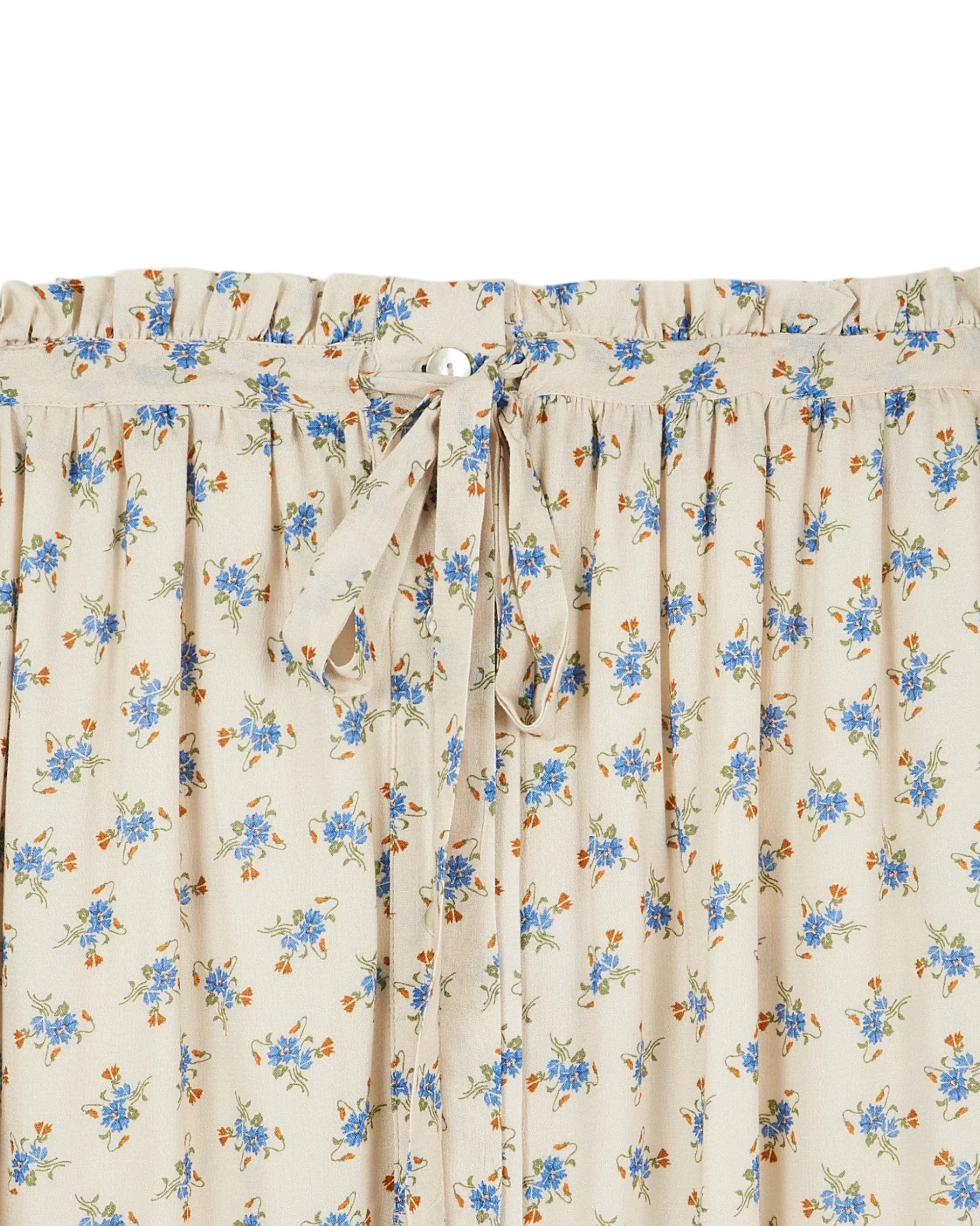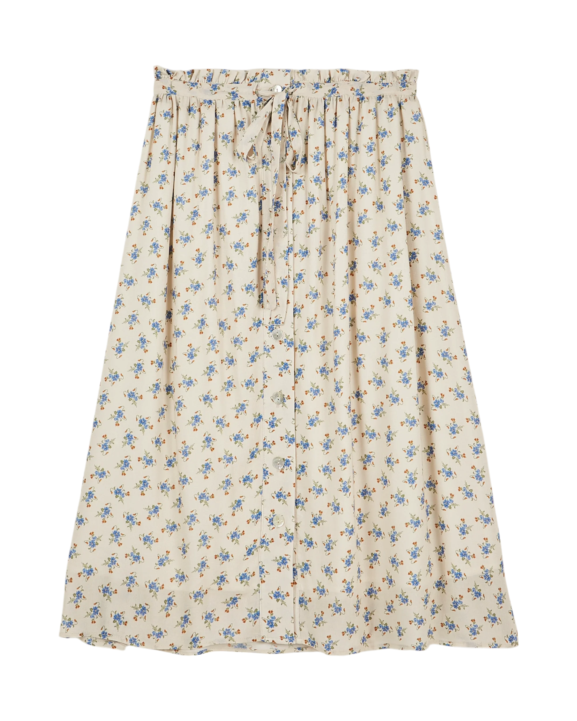 Mid-length skirt in off-white viscose, featuring blue flowers illuminated by touches of yellow. This material has a soft, silky, light texture. It also wrinkles very little, which seems to be an advantage. Lightweight yet fully lined, this skirt is perfect for a beautiful summer. The elasticated waistband in the back adjusts to the waist with a tie at the front. It’s topped by a frilly frill, the skirt’s only fantasy. Natural mother-of-pearl buttons close the skirt all the way up.