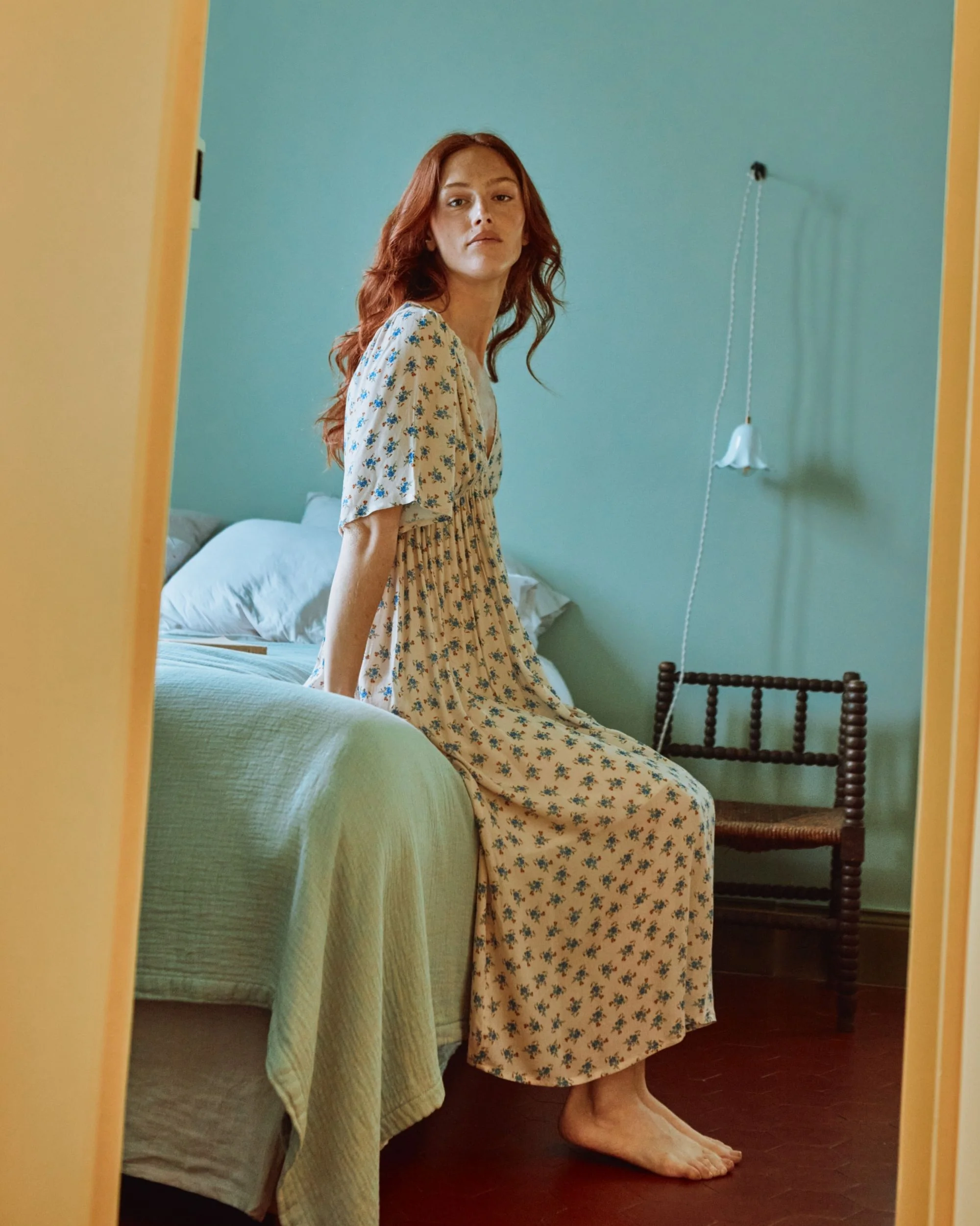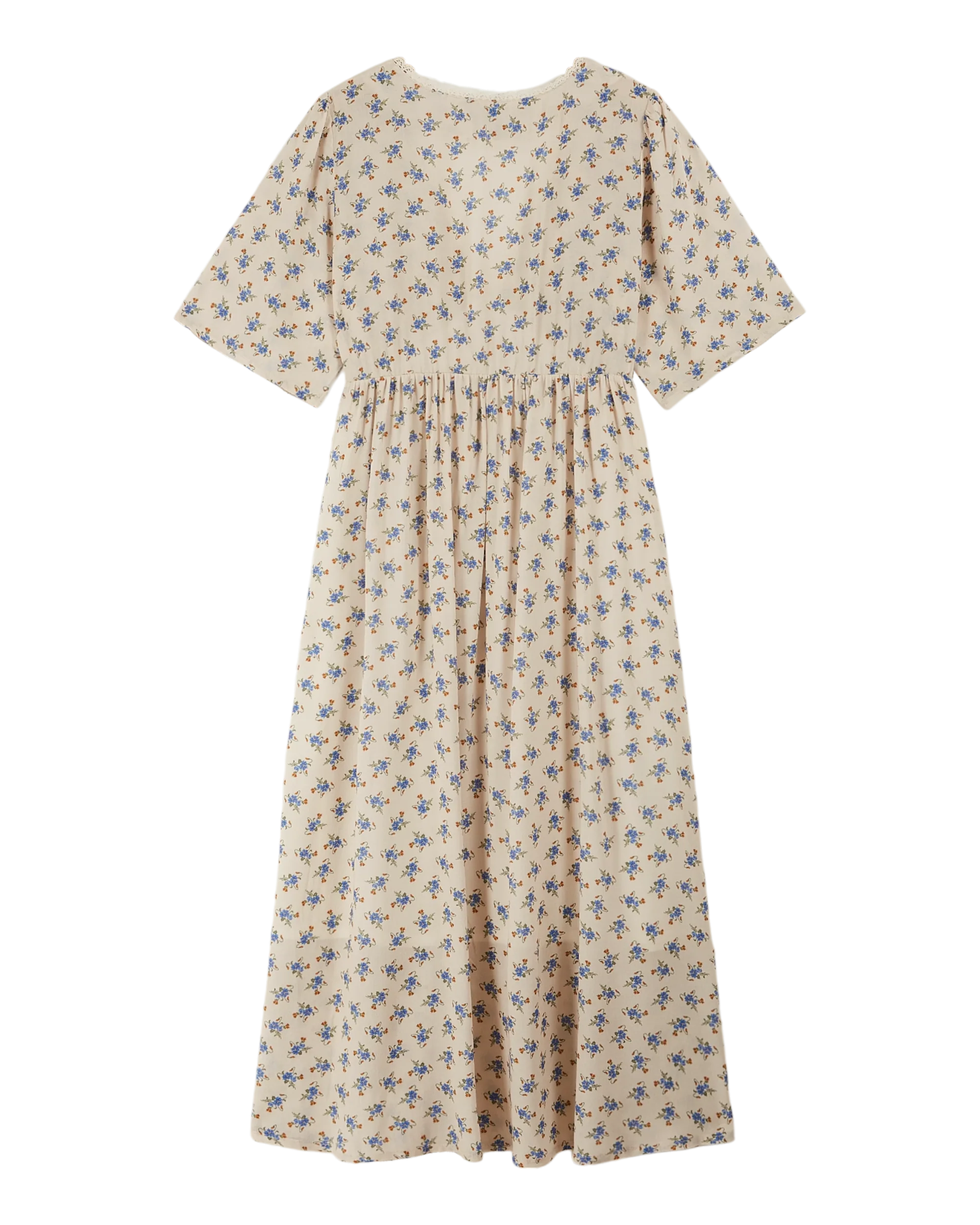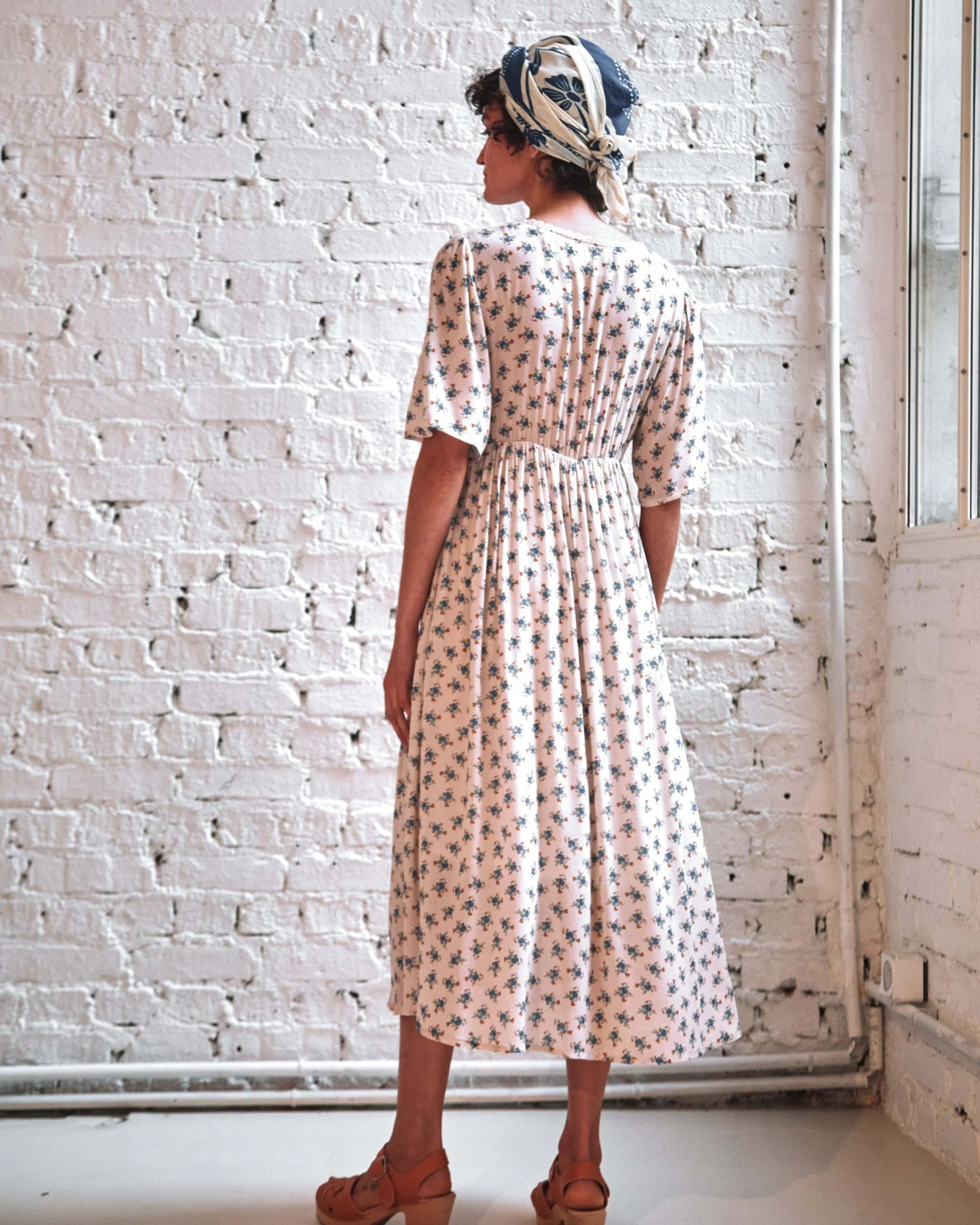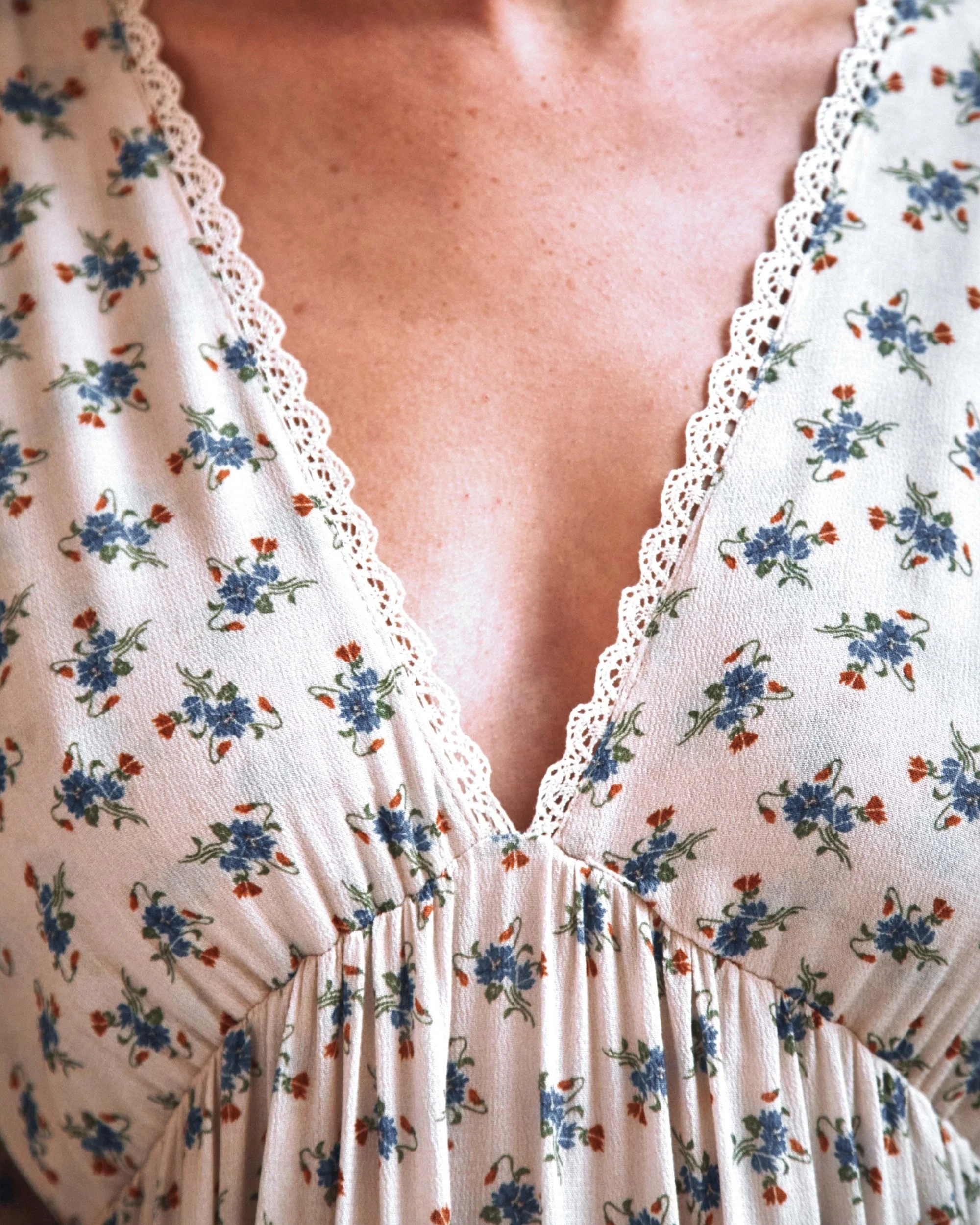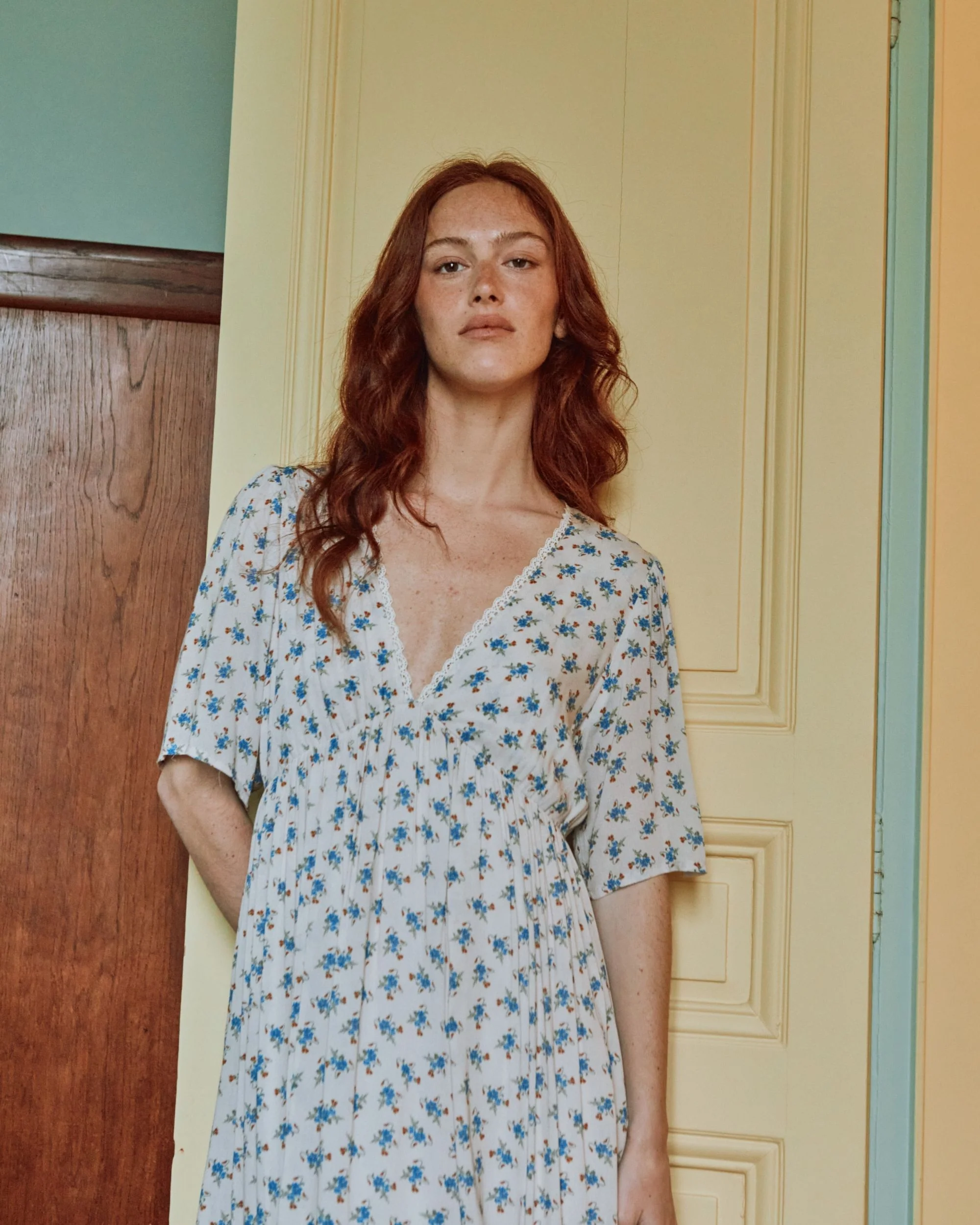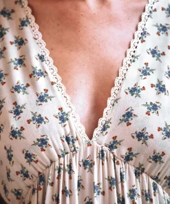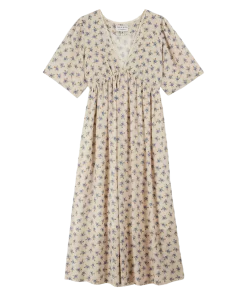 Long dress in ecru viscose adorned with a multitude of blue flowers. This soft, silky, light-textured fabric wrinkles very little. A little vintage dress, fully lined, with gathers at the top of the sleeves for volume and a deep V-neckline for femininity. The gathered skirt is set on an elasticated waistband cutout, which gently rises between the bust to emphasize it.