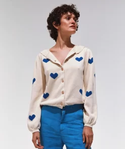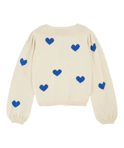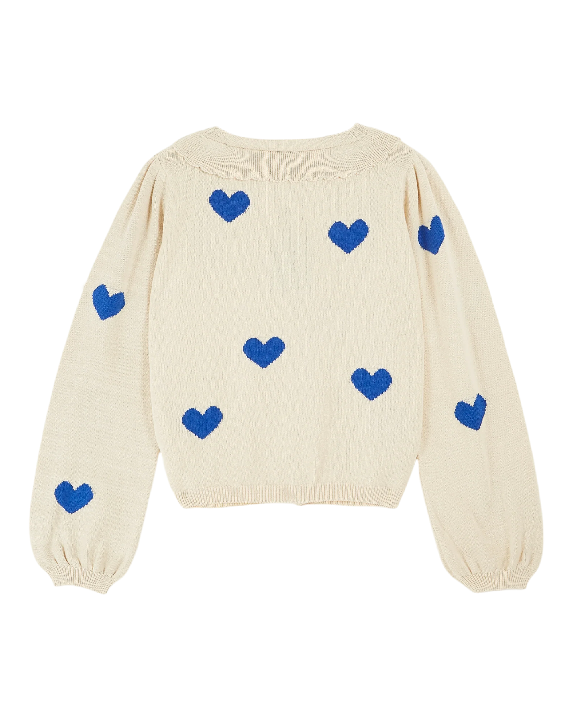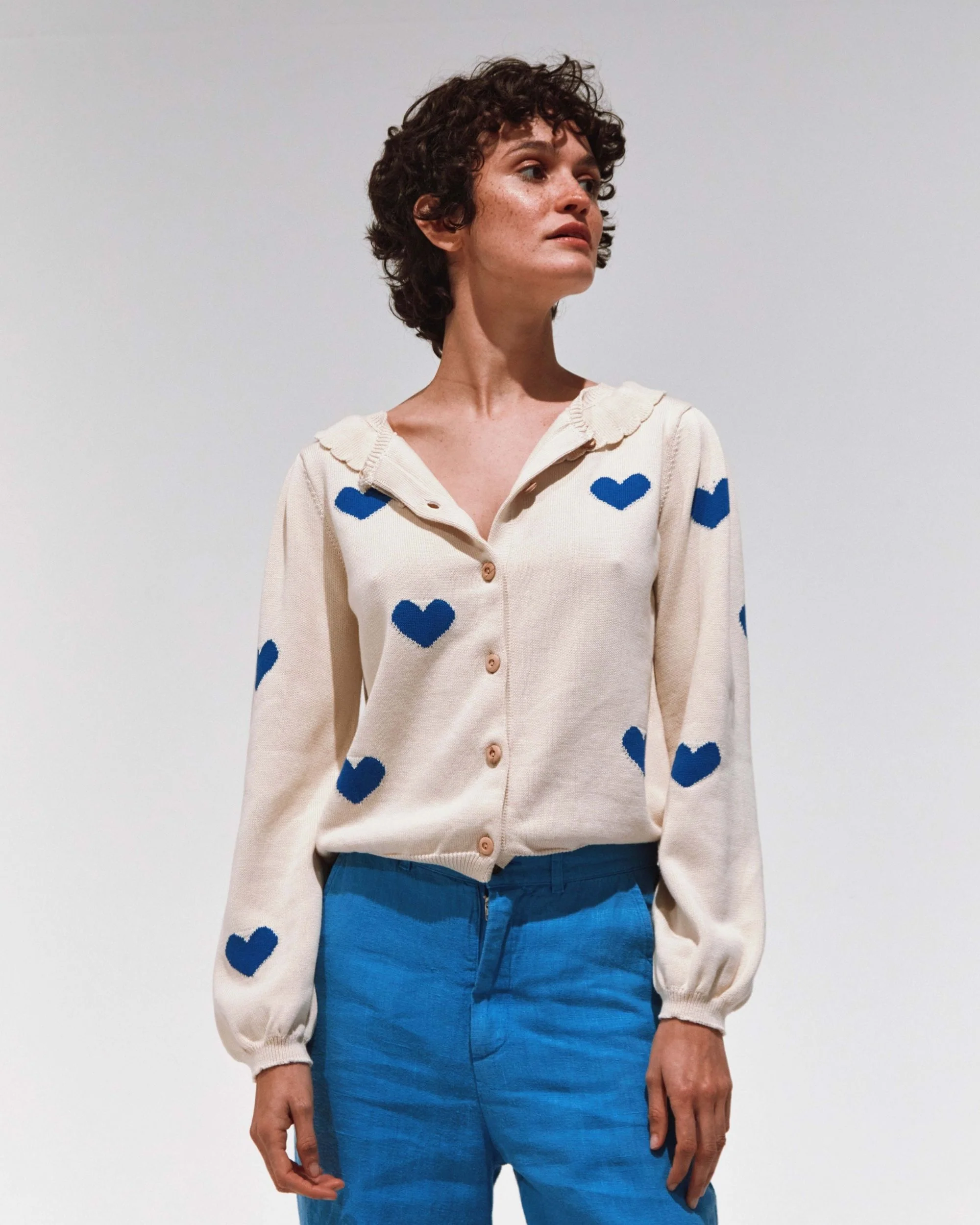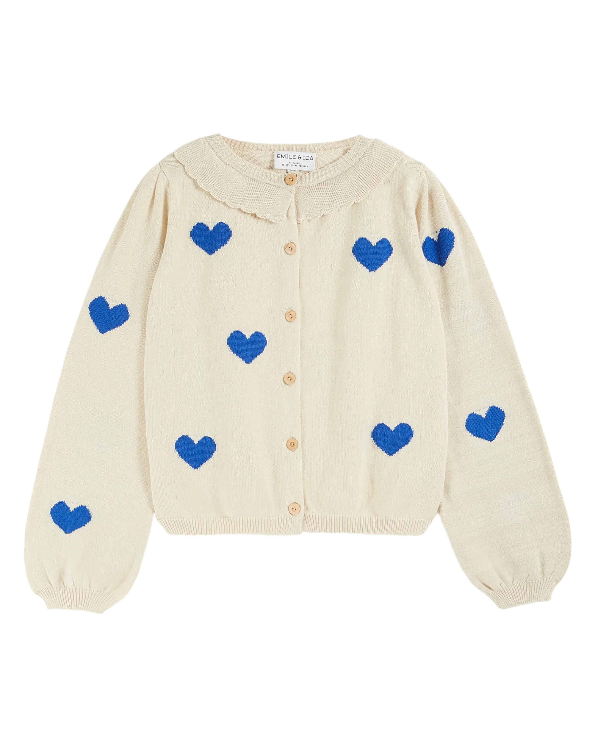 Intarsia jacquard cardigan in ecru organic cotton punctuated by blue hearts.