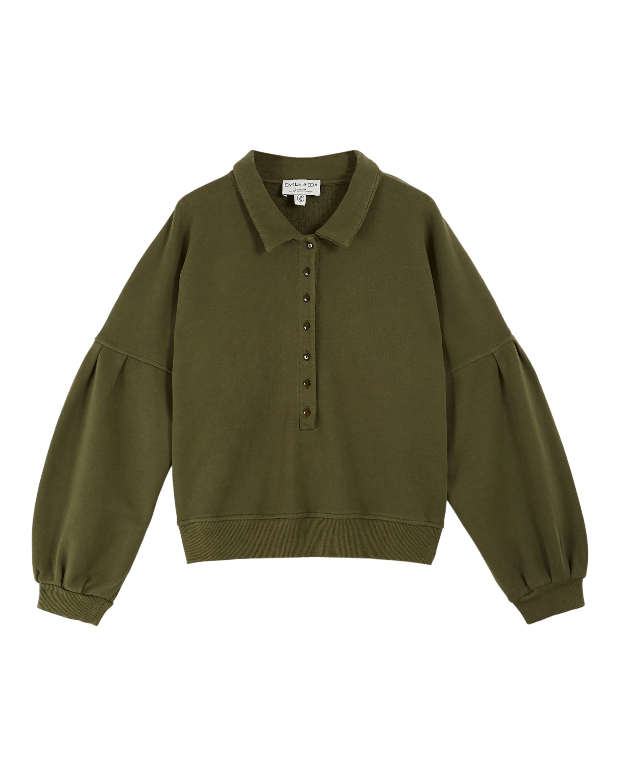 Sweatshirt in khaki organic cotton fleece. A pointed collar that breaks with the traditional ribbed hem, a delicate button opening, and offset sleeves with flat pleats that give them volume. These details feminize the sweatshirt and add a touch of originality.