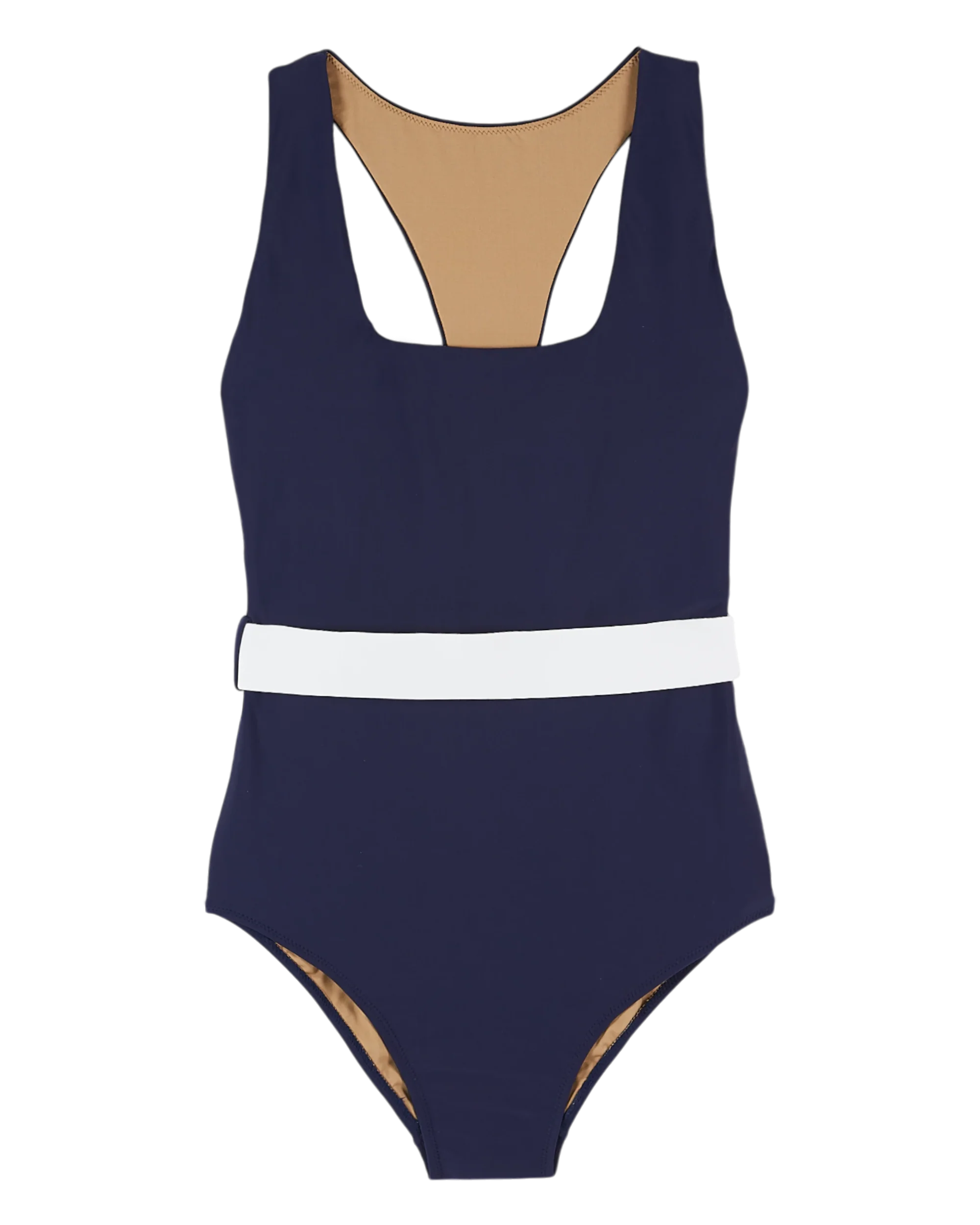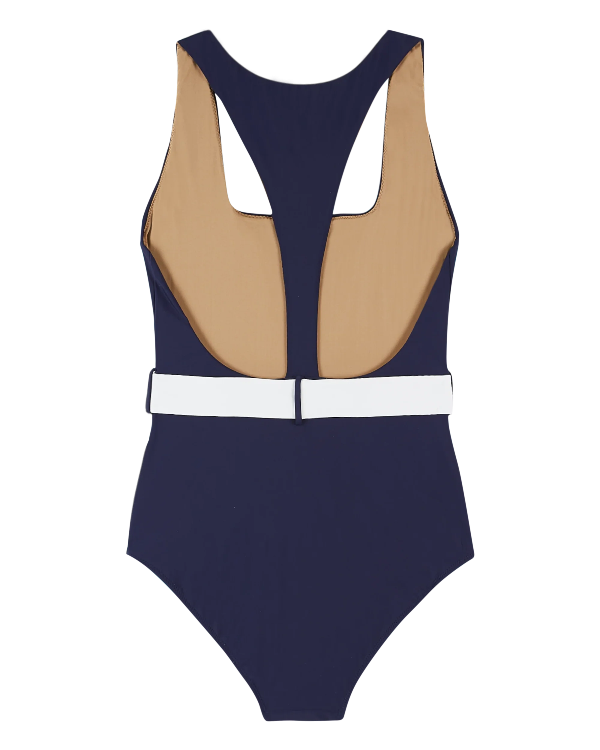 Plain navy blue 1-piece swimsuit with beige lining. Its scalloped back, square neckline and non-removable white belt make for a feminine, retro cut.