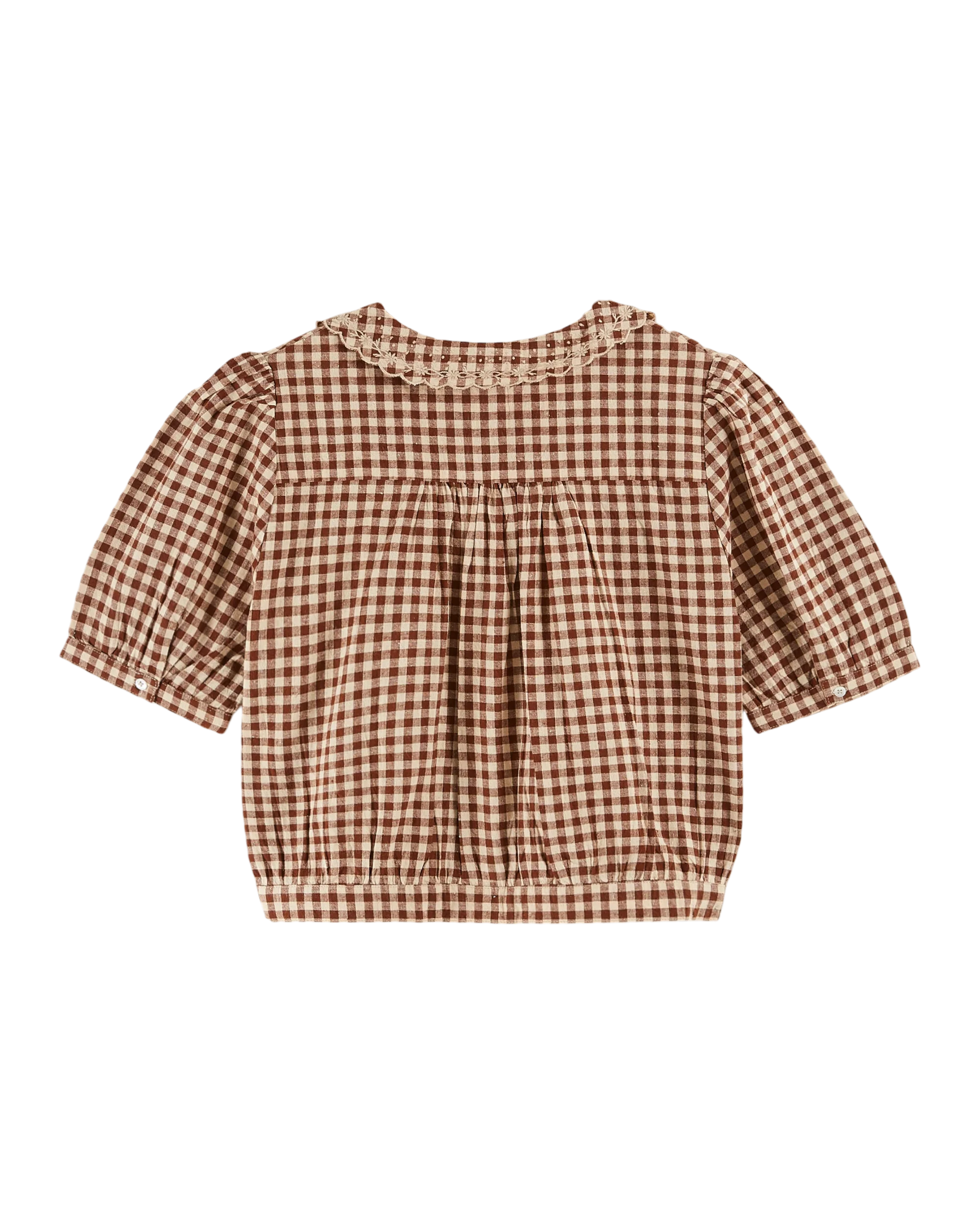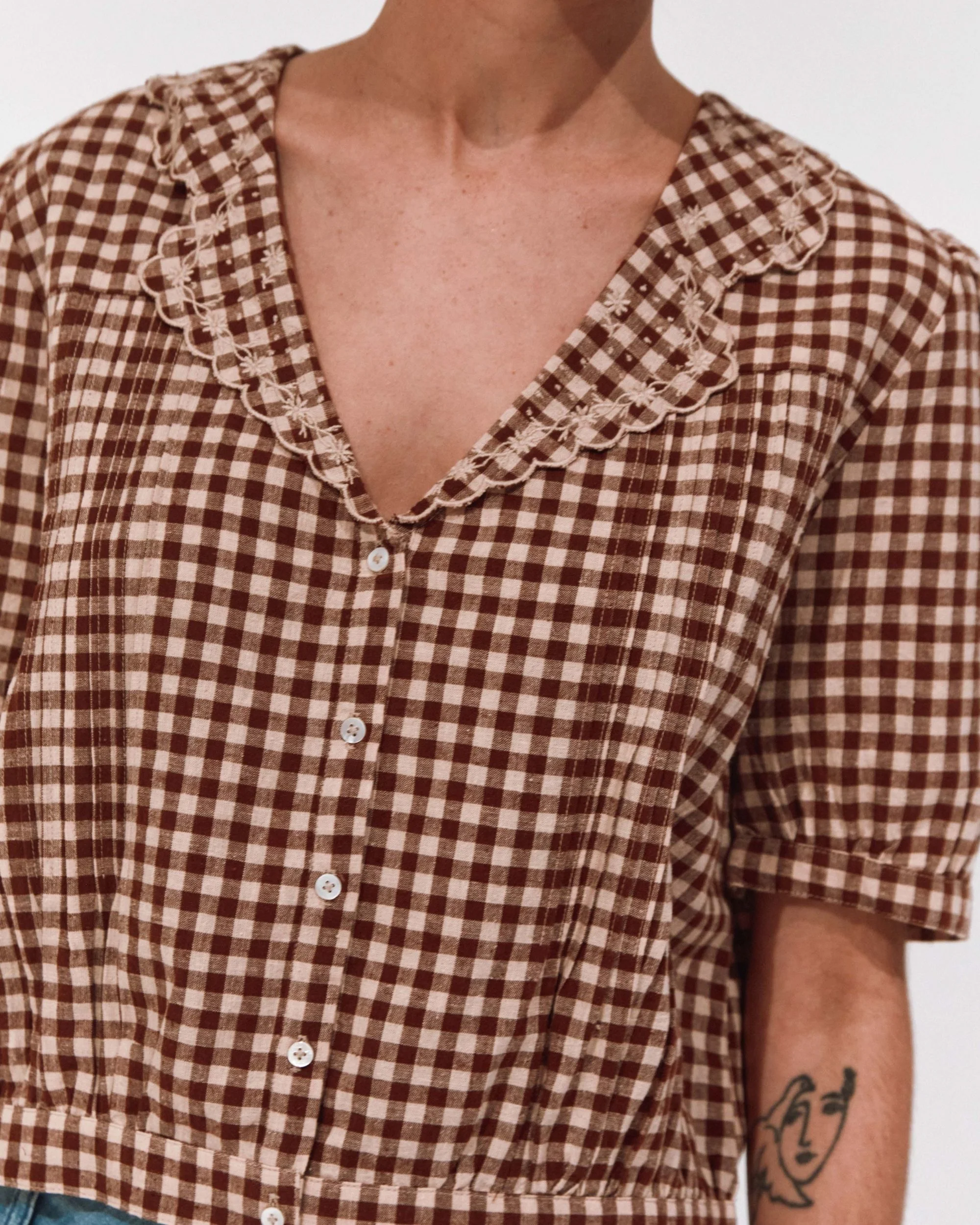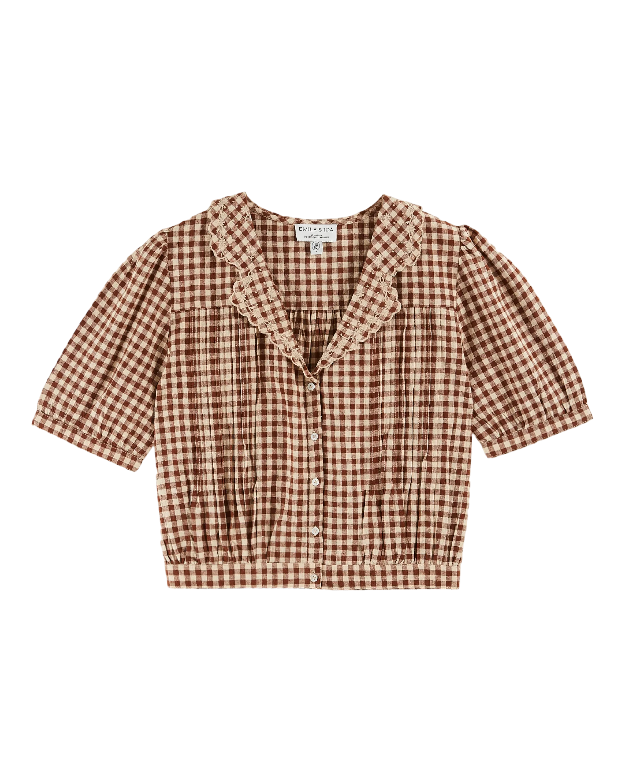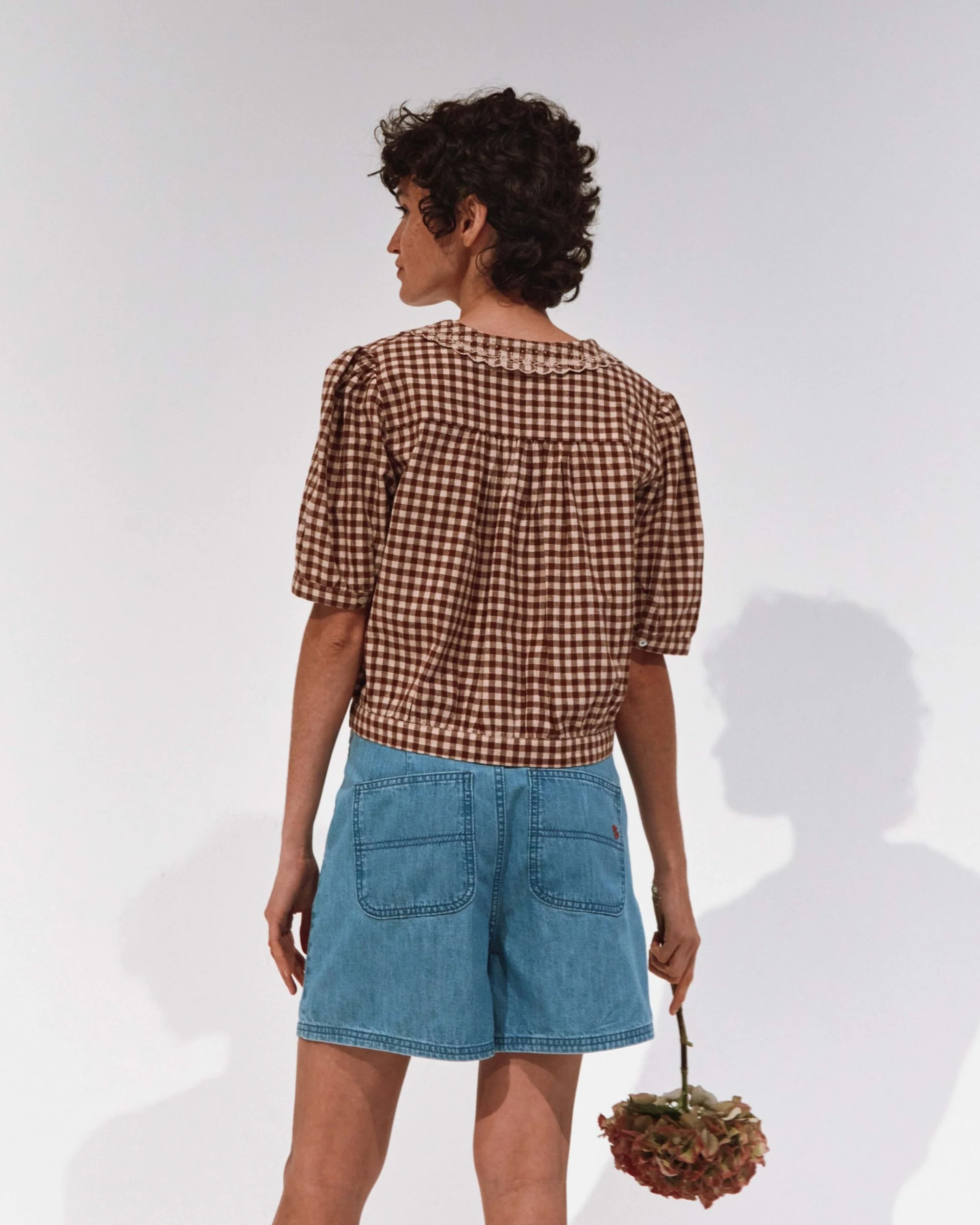 Chocolate and ecru gingham cotton blouse. A blouse with retro charm, sublimated by its ecru embroidery and recumbent pleats. The scalloped tailoring collar is adorned with a garland of floral embroidery.