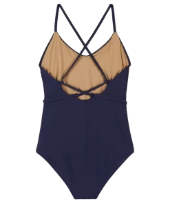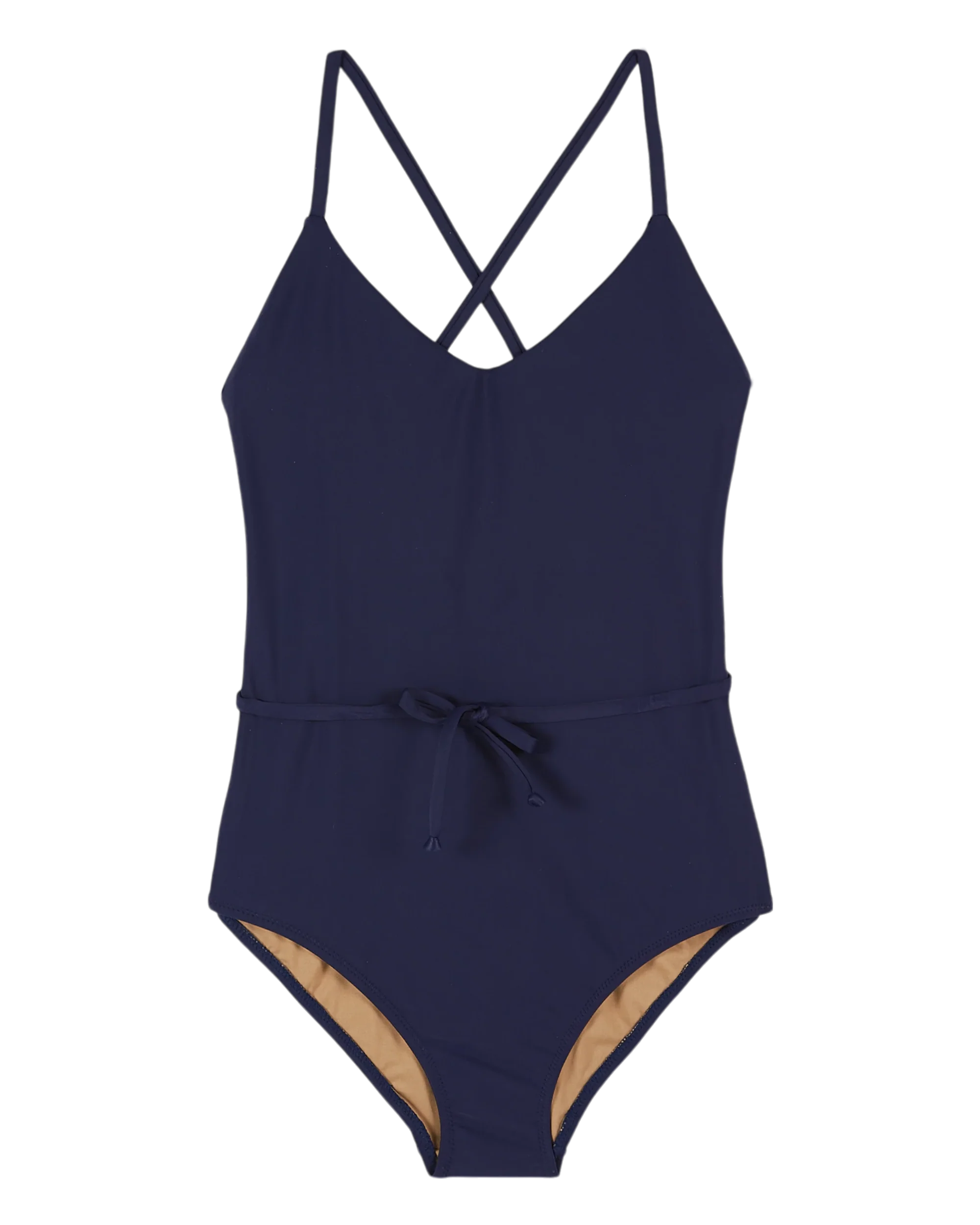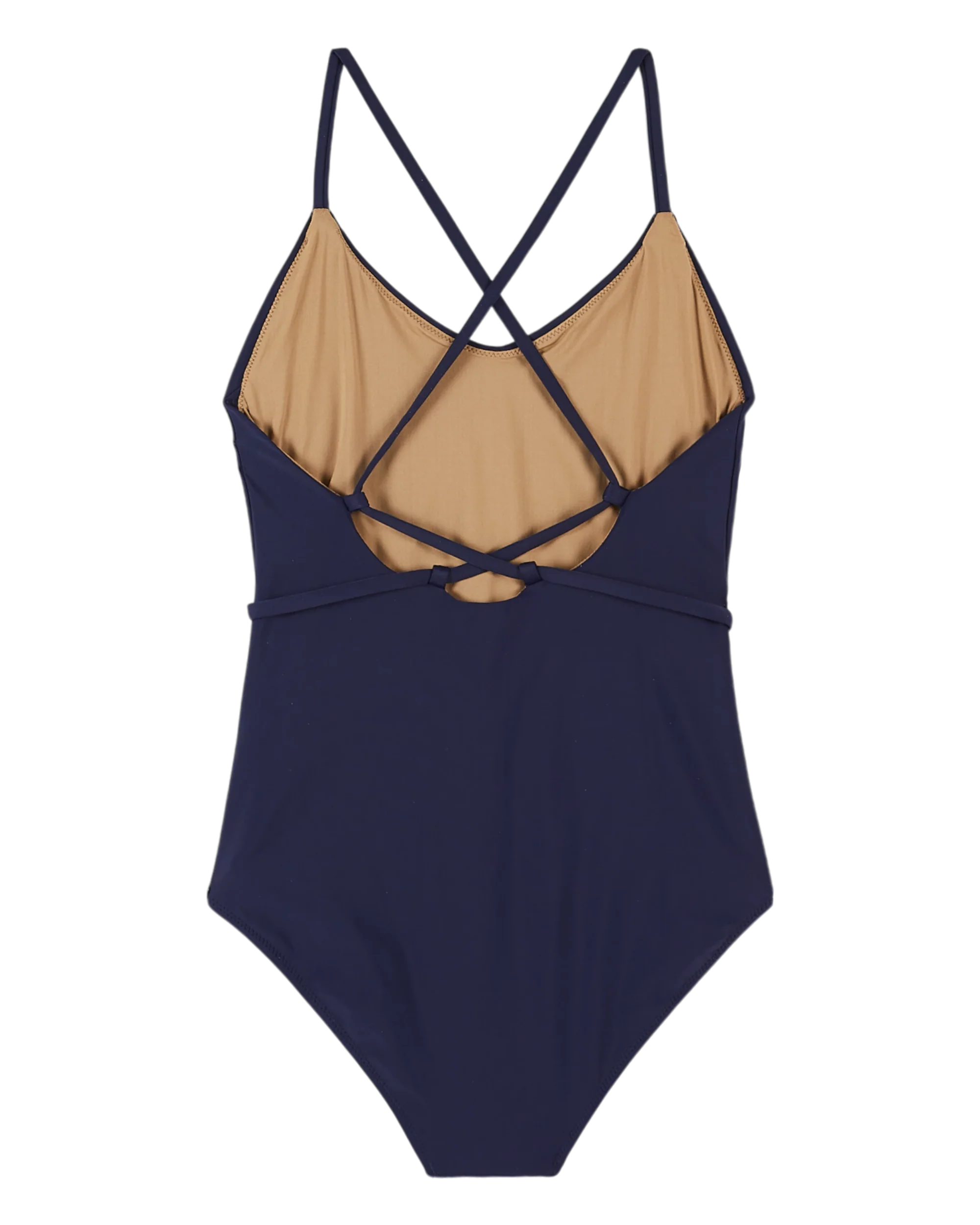 Plain navy blue 1-piece swimsuit with beige lining. Slender, adjustable straps cross at the back and join at the front or back with a delicate bow.