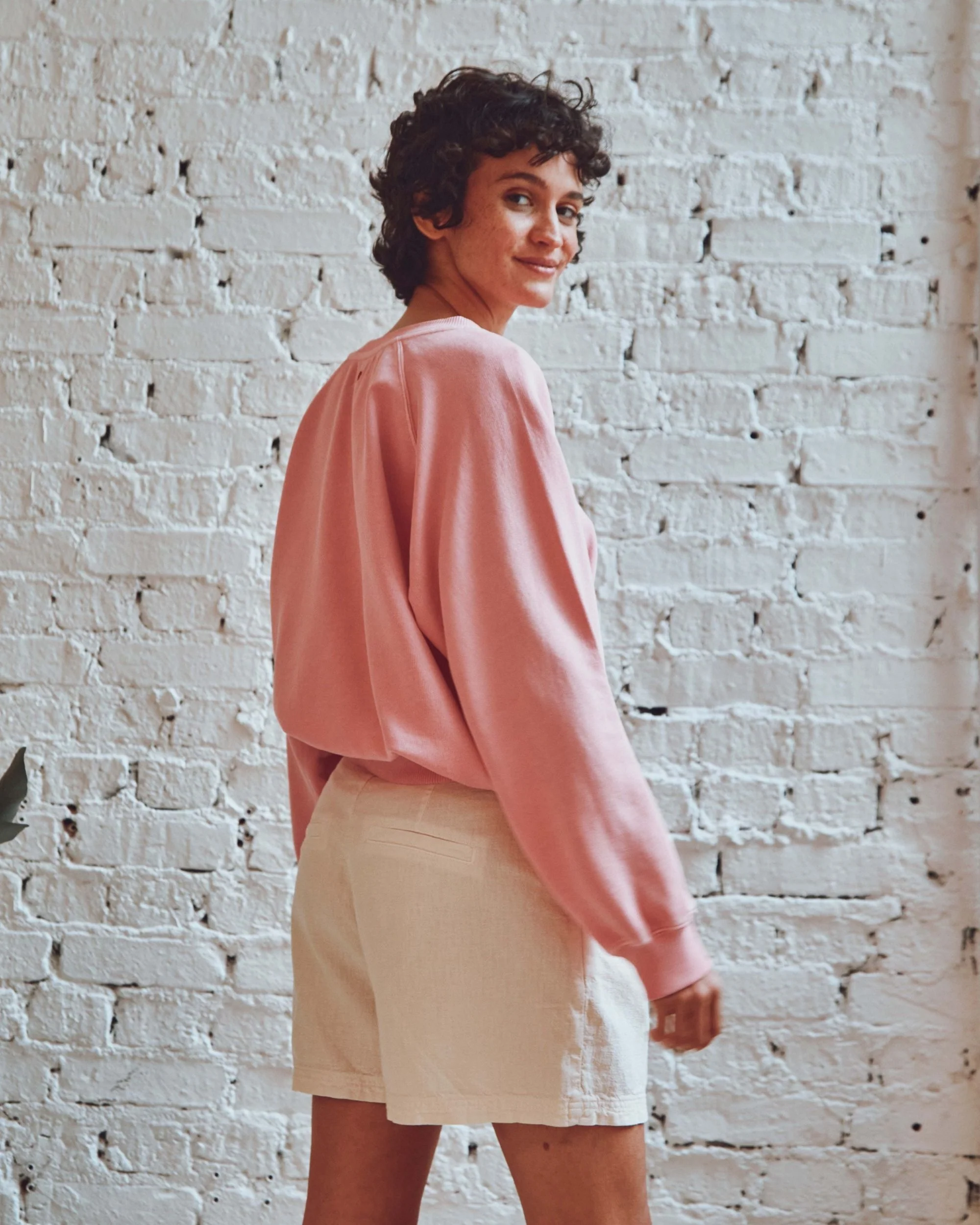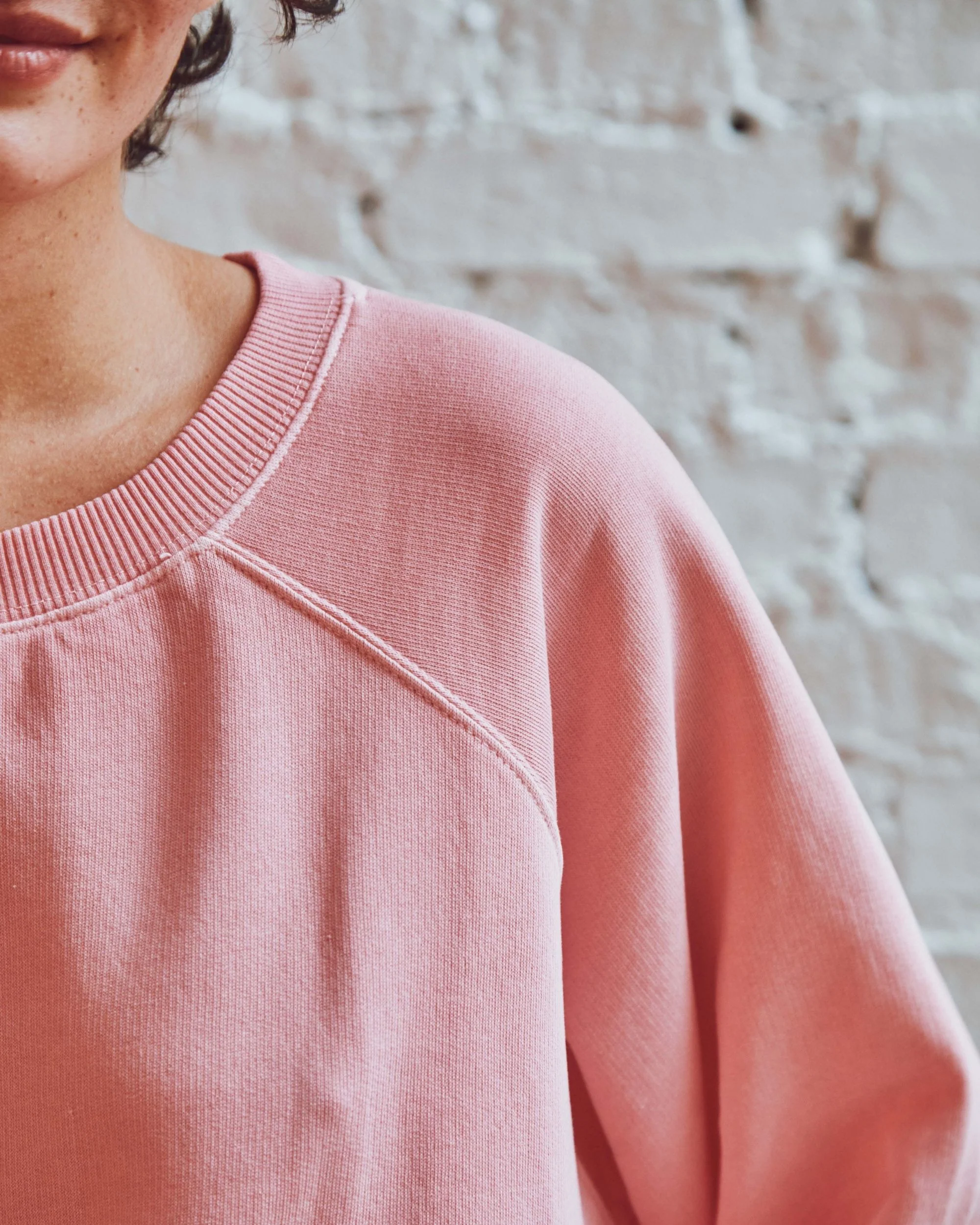 Sweatshirt in plain pink organic cotton fleece jersey. Featuring a classic, timeless cut, this sweatshirt wraps you in softness and comfort with its long raglan sleeves. The real uniqueness of this sweatshirt lies in its natural dyeing. It’s piece-dyed using mineral pigments, a more environmentally-friendly dyeing method. It also offers a subtle, unique color that develops a patina over time.