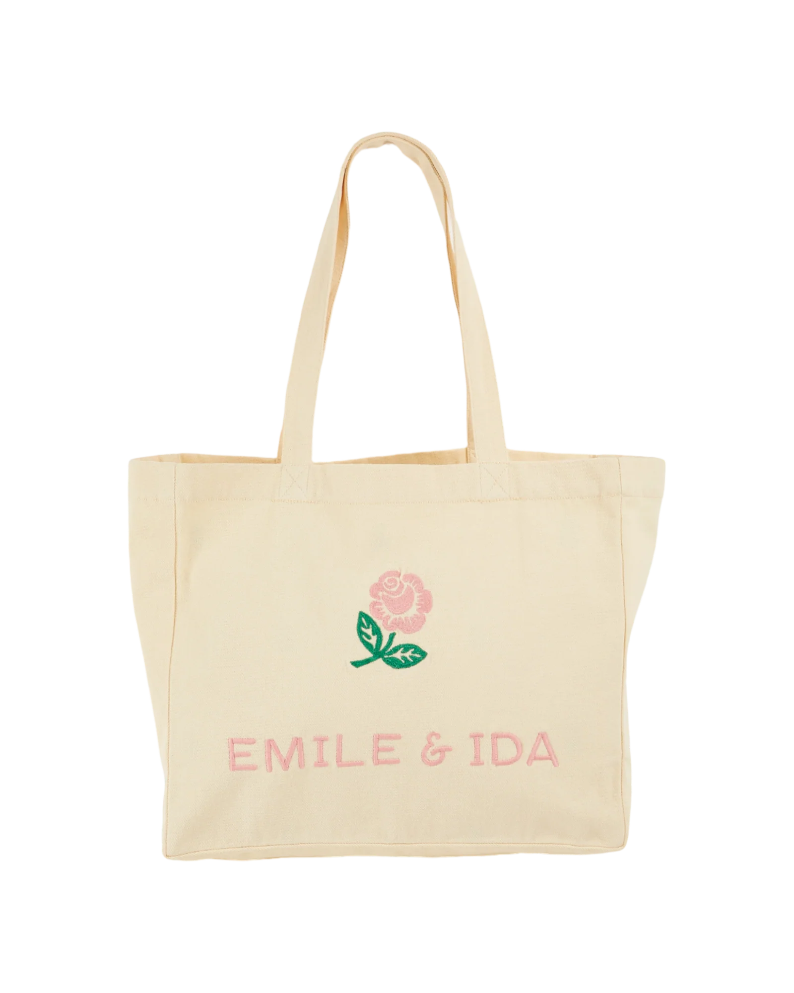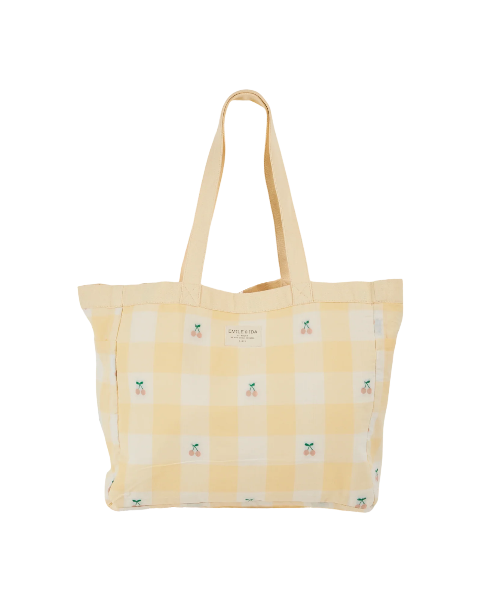 Yellow cotton shopping bag embroidered with our iconic logo and flower. With its large capacity, it seems capable of carrying everything with elegance and magic. Its pink cotton lining with fine white and green stripes adds a refined touch. – Two inside pockets – Flexible and lightweight – Fully lined Dimensions: 38 x 31 x 15 cm